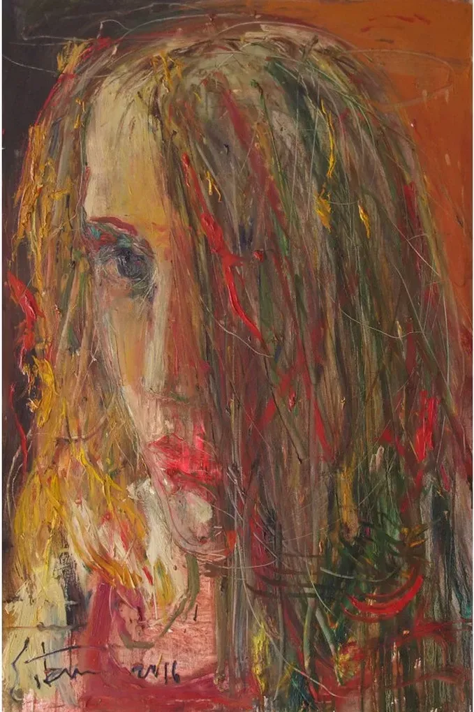 This 195x130 cm oil on canvas painting showcases a woman's face partially concealed by flowing strokes of fiery reds, deep greens, and golden yellows. The expressive brushwork and textured layers create a sense of movement, immersing the viewer in a world of contemplation and intrigue. Soft beige and muted pinks contrast with the bold hues, adding depth and emotional complexity to the composition.