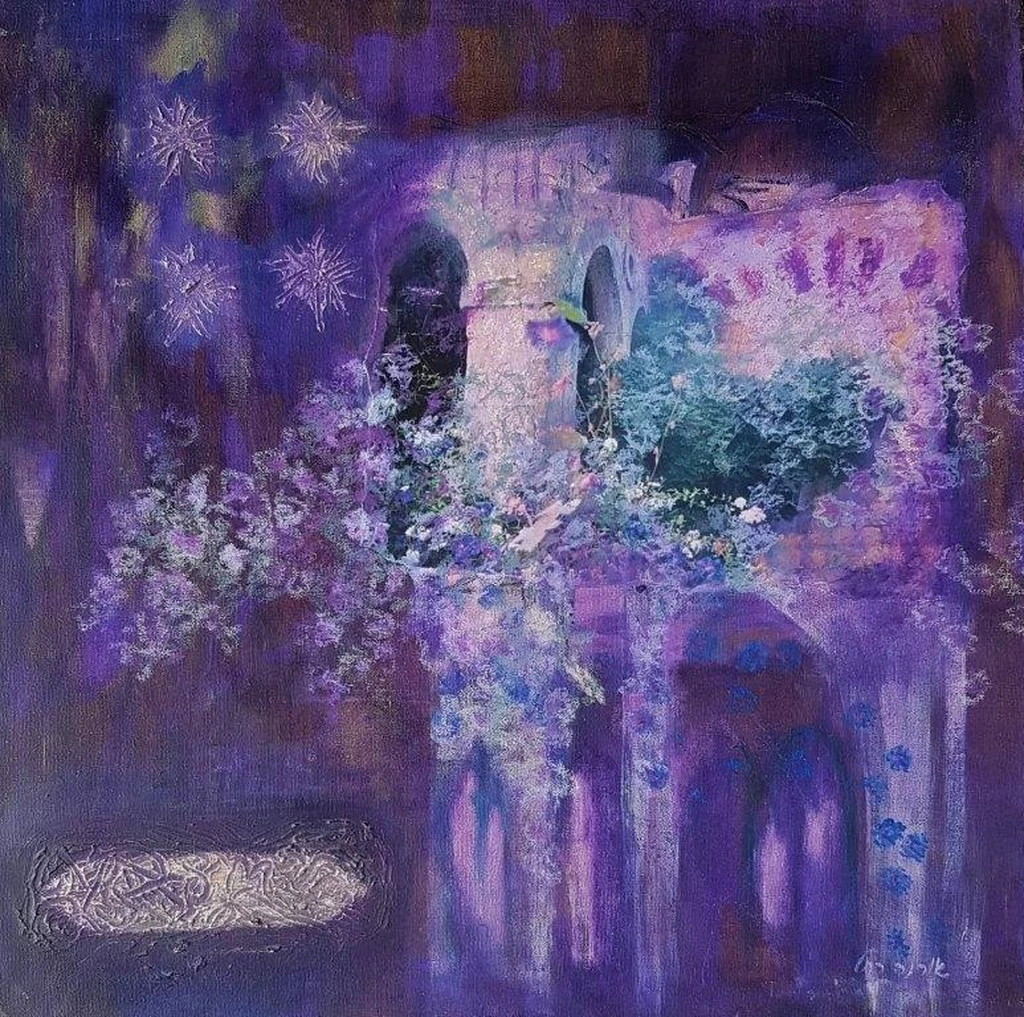 Weiner, renowned for infusing Kabbalistic and mystical themes into her paintings, uses Reflection as a means to explore the unknown. The gentle diffusion of color creates an ethereal atmosphere, while the mysterious floral elements and glowing archways invite the observer into a contemplative state. The sensation of looking through a veiled reality gives this piece a profound depth, making it perfect for spaces that encourage thoughtfulness and serenity.