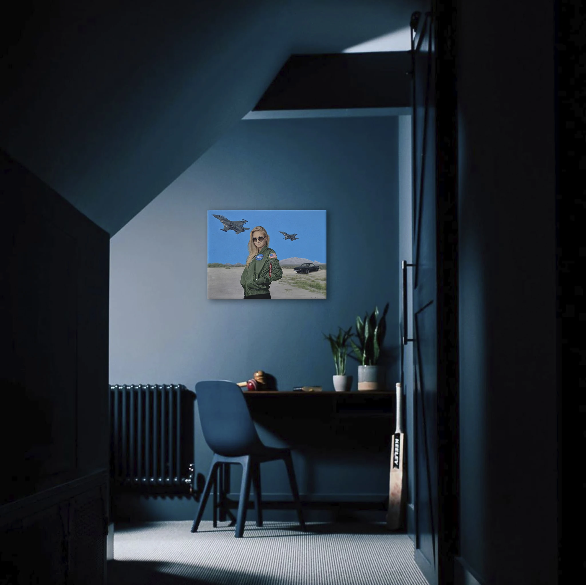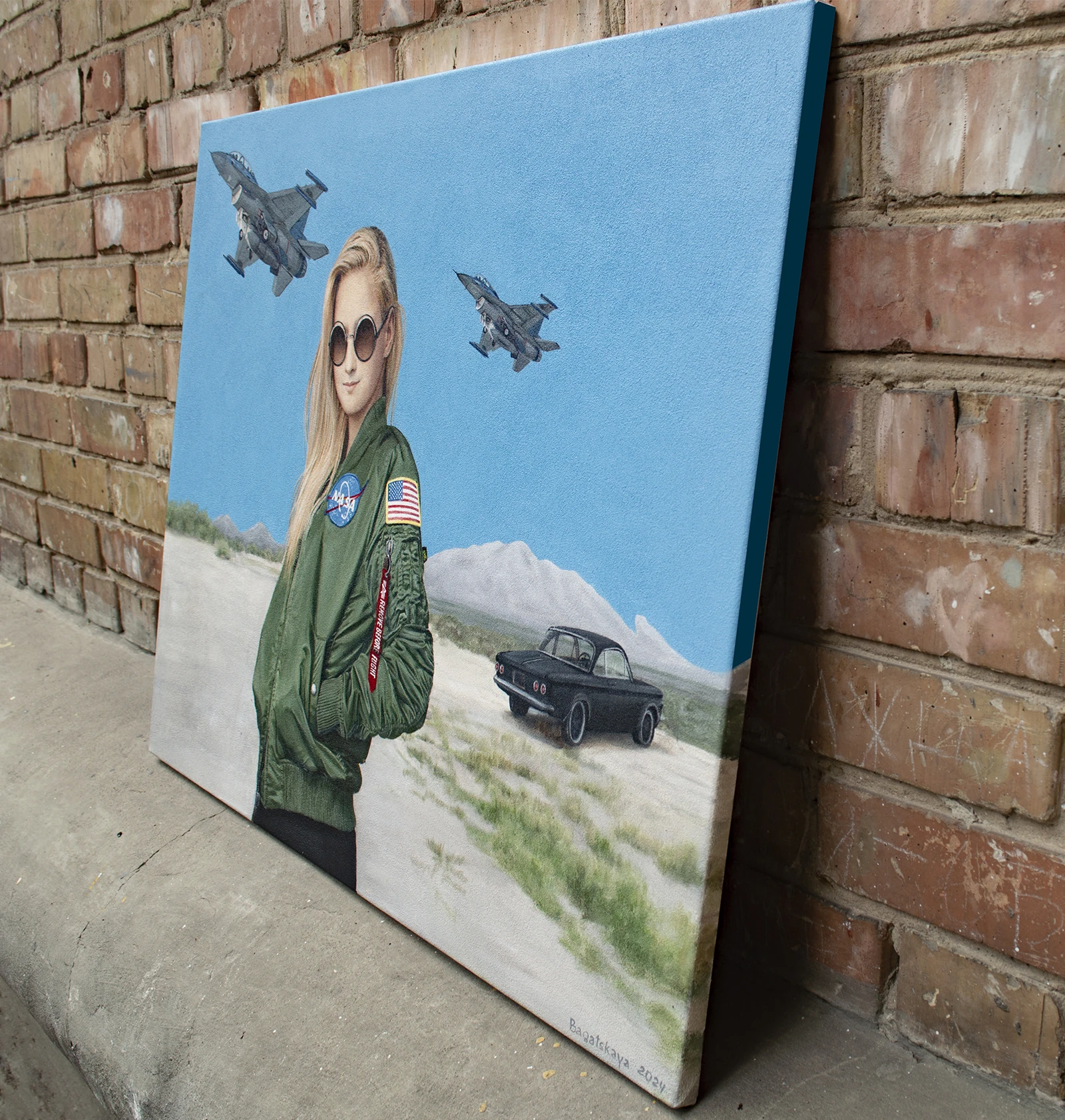 “Remove Before Flight” by Nataliya Bagatskaya presents a confident young woman dressed in a NASA flight jacket, standing with purpose in a barren landscape. Fighter jets soar above, evoking ambition and progress, while a classic black car sits still, grounding the composition in memory. Through acrylic realism and symbolic staging, the artwork reflects the personal tension between history and future, power and serenity. This cinematic piece encourages viewers to reflect on bold aspirations. Created with Dutch acrylics and Italian cotton canvas, it is part of the “Life in Avatar” series and comes signed with a certificate of authenticity.