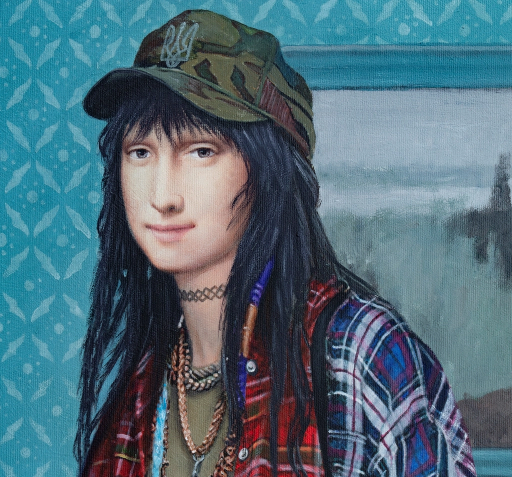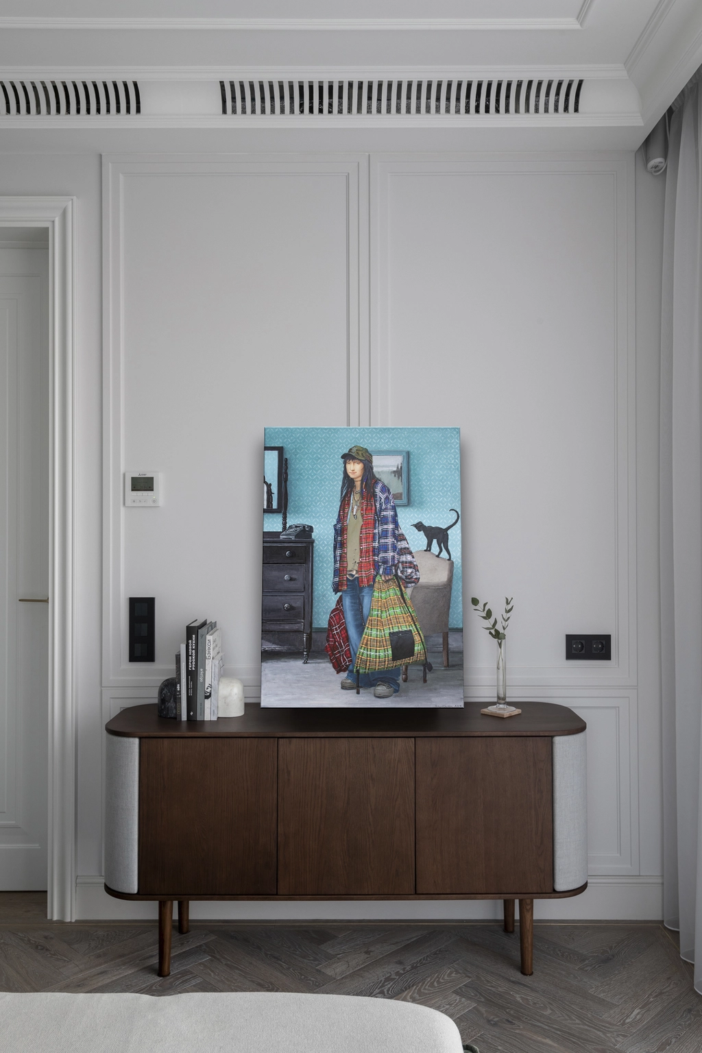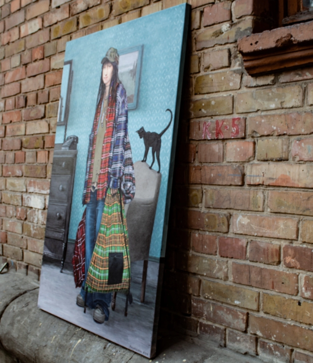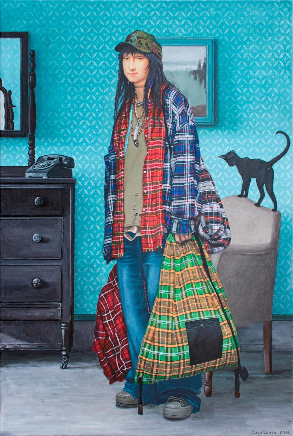 The juxtaposition of vibrant patterns and muted tones creates a dynamic visual narrative inviting viewers to explore the relationship between tradition and contemporary style. The detailed textures from the layered clothing to the furniture reflect Bagatskaya’s mastery of hyperrealism. The overall atmosphere is playful yet comforting making this piece an ideal addition to living rooms galleries or personal studies. Return offers a unique perspective on the beauty of personal expression and the warmth of familiar spaces.