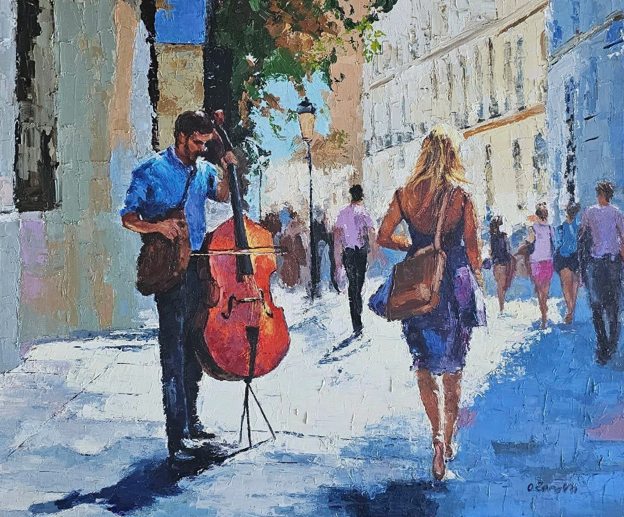 “Rhythms of the Street” by Olga Egorov captures a fleeting yet vibrant moment in an urban scene, where the rhythm of life and music blend seamlessly into a vivid canvas. This 60x50 cm oil painting features a street musician playing a double bass on a sun-drenched sidewalk as passersby go about their day, each lost in their own motion yet momentarily connected by the tune.