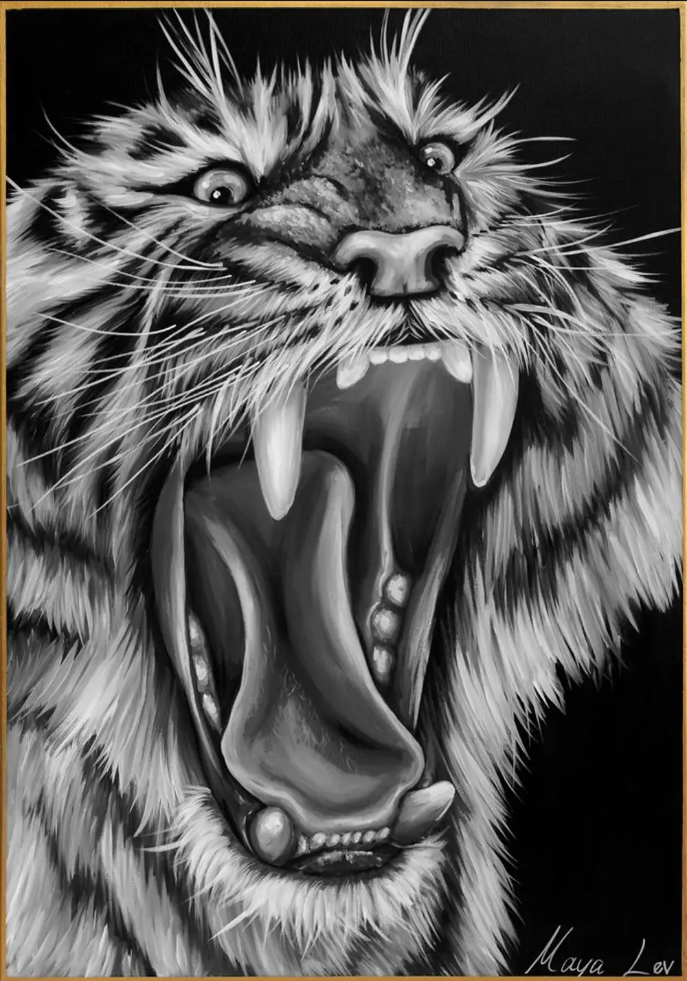 The "Roaring Tiger" painting is a striking representation of raw animalistic power and untamed beauty. In a dramatic monochrome palette, Maya Lev captures the essence of a tiger in mid-roar, its mouth agape, fangs on full display, and eyes ablaze with intensity. The detailed brushwork gives life to the tiger's fur, adding a tactile realism to the image. Lev's use of light and shadow accentuates the contours of the tiger's face, enhancing the dynamic energy of the moment. This piece radiates a mood of awe and respect for the wild, making it an ideal choice for spaces where inspiration and a connection to nature are desired, such as studies, offices, or lounges. The large size ensures it commands attention, becoming a focal point that sparks conversation and admiration.