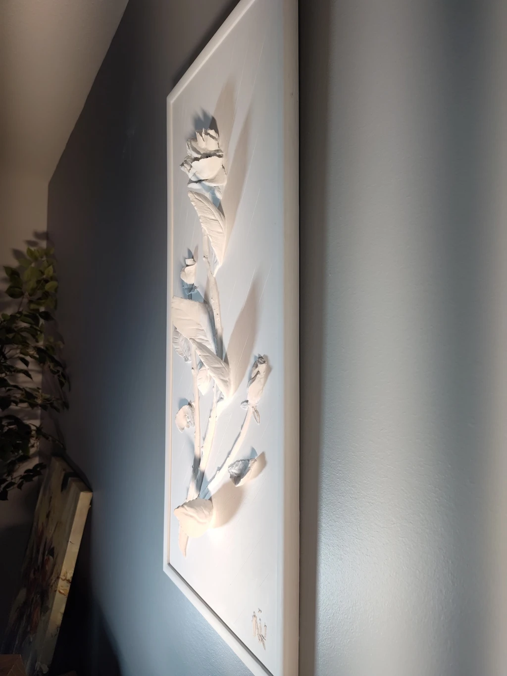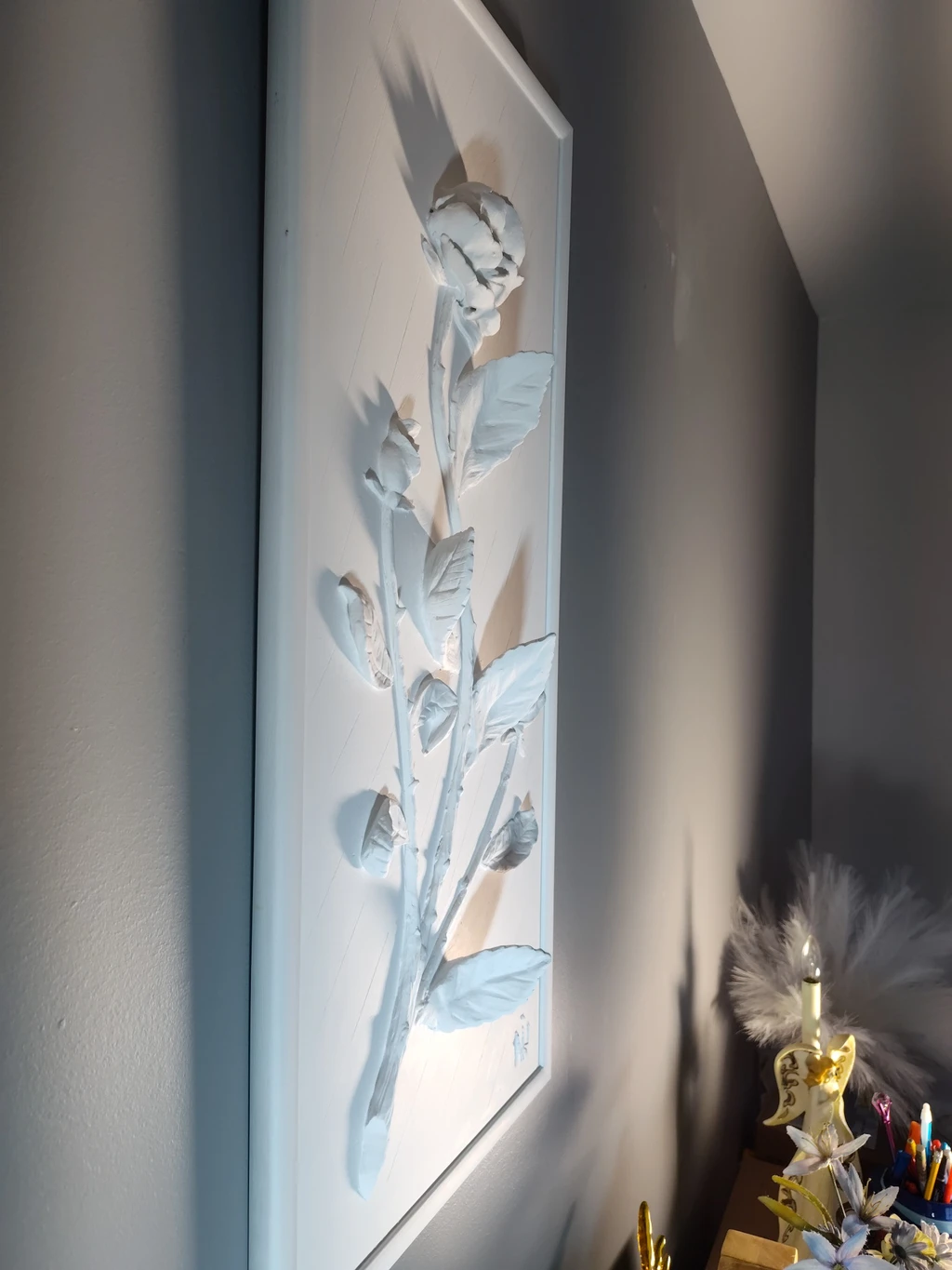 The play of light and shadow across the textured surface gives the piece a dynamic depth, allowing it to shift in appearance throughout the day. The soft, neutral tones emphasize purity and serenity, making "Rose" not just a visual statement but an emotional one—evoking feelings of calm, nostalgia, and appreciation for nature’s intricate beauty.