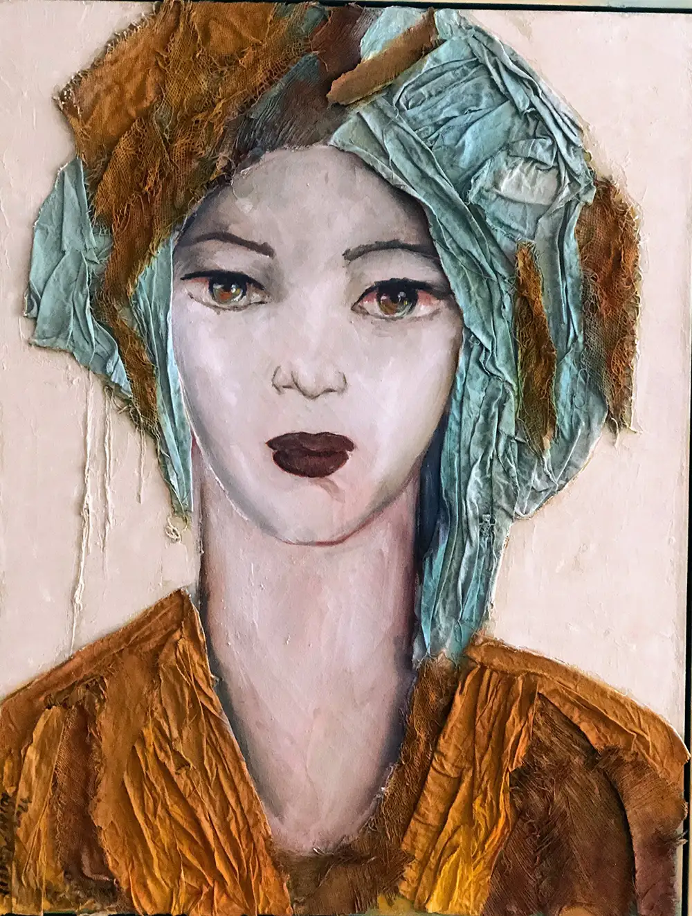 In "Rose des Sables 9", the artist Liliane Danino continues to explore the theme of textured portraiture with a serene yet expressive subject. The artwork features a delicately rendered face, the gaze of which is imbued with a sense of quiet introspection. The layered fabrics in tones of terra-cotta, sage, and rust create a tactile depth, enriching the visual experience. At 116x89cm, the portrait's scale allows for an immersive encounter with the nuanced expression and rich textures. This piece is likely to resonate with an atmosphere of contemplation and nuanced beauty, making it well-suited for personal spaces like a bedroom or study, or a public area such as a boutique hotel lobby or an intimate art gallery.