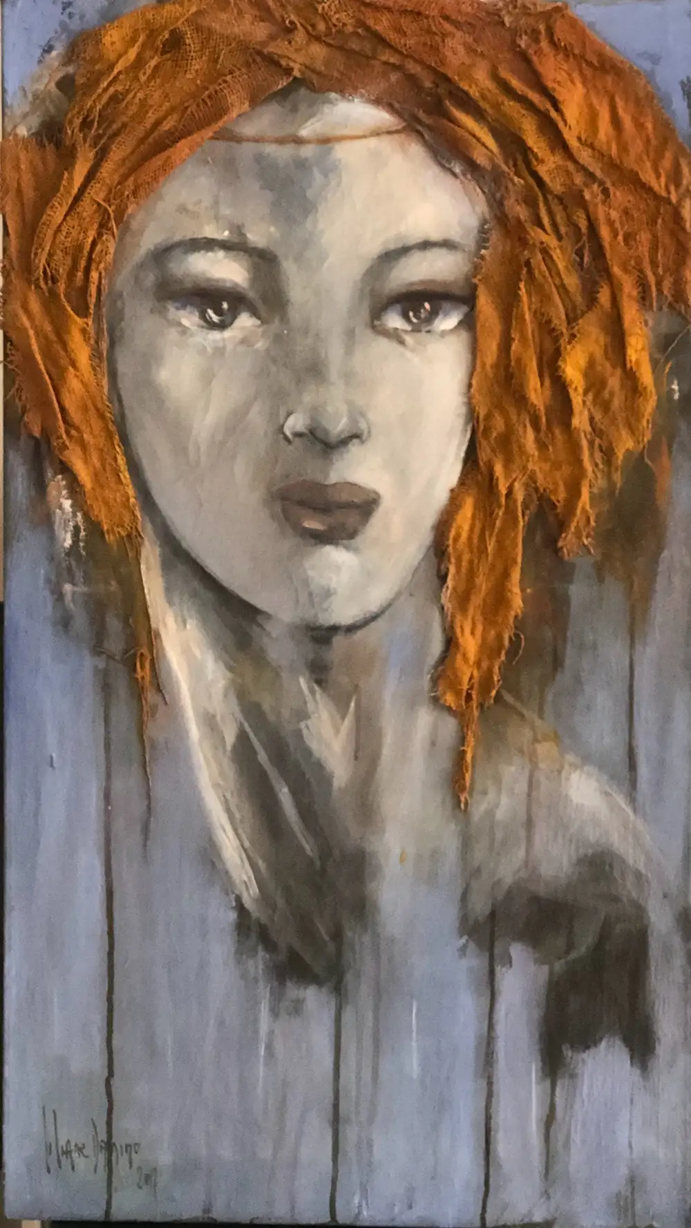 Liliane Danino's "Rose des Sables 8" is a captivating representation of a face, where the subject's gaze is a focal point, framed by the orange-hued, fabric headdress, which provides a dynamic contrast to the cool, muted tones of the background. This portrait blends melancholic and introspective qualities with an element of the ethereal. The expansive size enhances the piece's presence, making it a statement artwork that commands attention. The emotional depth suggested by the eyes and the flowing forms are suitable for creating a reflective ambiance. This painting would be a significant addition to environments such as a main living area or a spacious lobby, where the art can be contemplated and appreciated.