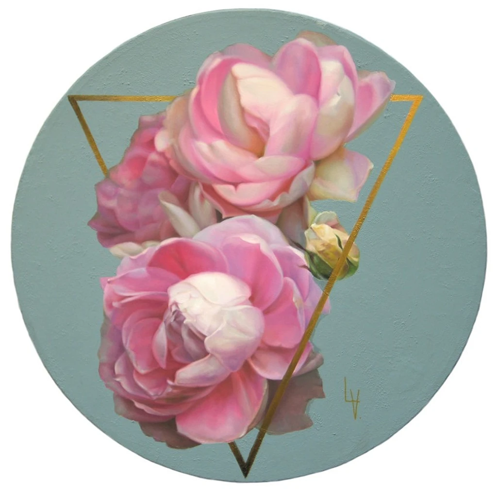 This hyperrealistic oil on canvas piece showcases an intricate composition of pink roses blooming against a muted green background, accentuated with gold geometric elements. The play of light and shadow breathes life into the petals, making them appear almost tangible, as if swaying in a gentle breeze. Luchkiv’s masterful technique, influenced by his academic background and deep artistic lineage, captures not only the botanical beauty of roses but also their symbolic essence—love, grace, and fleeting moments of perfection. The round canvas adds a unique dimension to the artwork, enhancing its dreamlike atmosphere. The soft pink tones exude warmth and tenderness, while the gold accents introduce a touch of luxury, making this painting ideal for elegant interiors. Whether displayed in a bedroom, living room, boutique, or spa, "Roses" transforms spaces into havens of tranquility and sophistication. Luchkiv’s ability to merge realism with emotion makes this piece a timeless celebration of nature’s artistry. A perfect choice for collectors who appreciate fine floral still-life paintings with a modern touch.