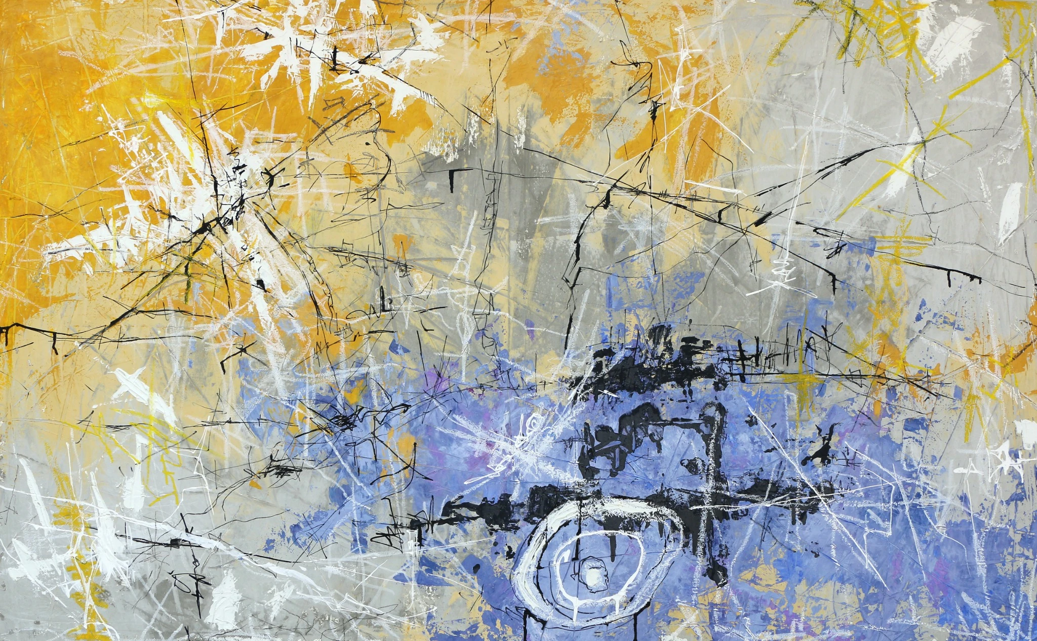 The prominent circular motif anchors the work, surrounded by a cascade of intersecting lines and layered textures, suggesting movement and focus. The painting's color palette is a harmonious blend of warm yellows and golds, cool purples and blues, and neutral grays, punctuated with bold black and white accents. These elements evoke a sense of energy and curiosity, while the layered structure adds depth and intrigue. "ROUND" is a bold statement piece, perfect for modern interiors and public spaces seeking a dynamic and contemporary aesthetic. Dubi Ronen, a seasoned Israeli artist, brings his integrated design expertise to life in "ROUND," merging fine art with architectural sensibilities. Ideal for creative workspaces, gallery exhibitions, or contemporary living rooms, this piece transforms any space with its bold, thought-provoking presence.
