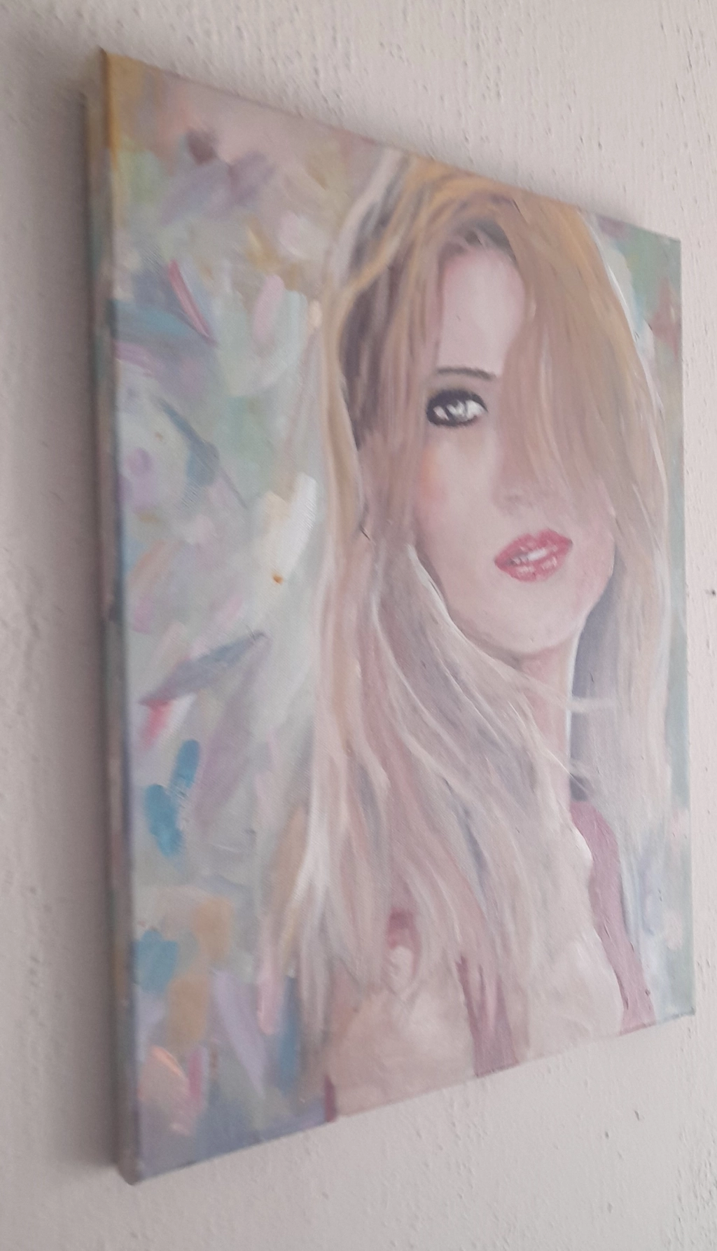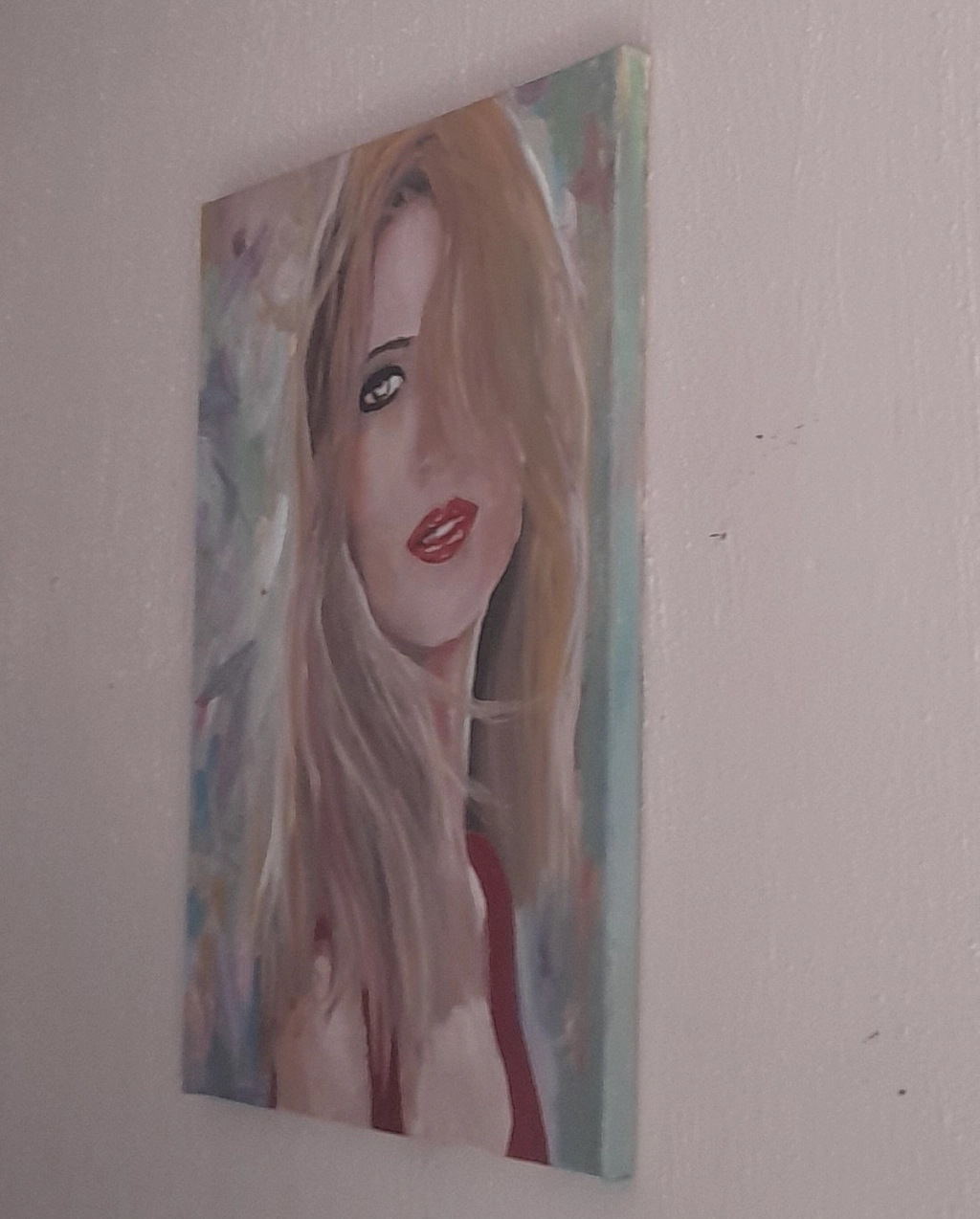 Painted in oil on a 40 x 50 cm stretched canvas, the portrait brings to life a moment of quiet strength. The subject’s vivid red lips, captivating eye, and loosely flowing blonde hair create an expressive, almost cinematic presence—made even more evocative by the pastel-toned, dreamlike background.