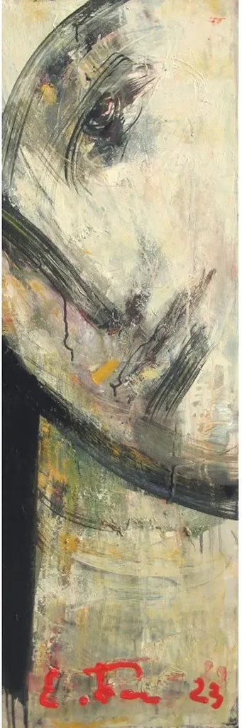 Measuring 120x40 cm, this oil on canvas painting features a fragmented, dreamlike face emerging through soft beige, cream, and muted earthy tones. Striking black strokes define the contours, while subtle hints of red and yellow add warmth and depth, enhancing the painting’s expressive and introspective quality.