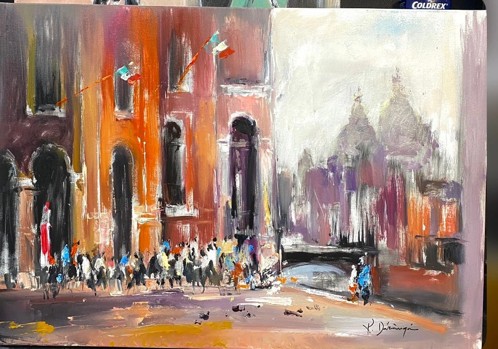 The color palette of warm red, deep orange, soft beige, and muted purple enhances the painting’s historic and romantic essence. Dărângă’s technique, influenced by Romanian greats like Nicolae Grigorescu and Corneliu Baba, brings to life the architectural splendor and lively crowd, evoking a timeless sense of wonder and nostalgia.