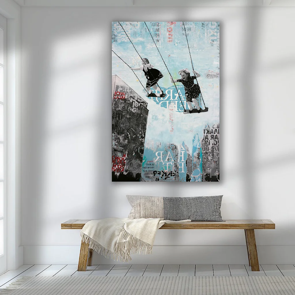Measuring 120 x 80 x 2 cm, this dynamic artwork depicts two children on swings, soaring high above a collage of urban elements. The sky-blue background, layered with textures, typography, and abstract patterns, contrasts beautifully with the monochromatic rendering of the children, creating a sense of adventure and dreamlike freedom. Waterman’s skillful use of acrylics, oils, charcoal, and collaged elements adds depth and movement to the composition, evoking a connection between the spontaneity of childhood and the structured, layered world of the cityscape. The bold contrast of the swings’ silhouettes against the vibrant backdrop invites viewers to reminisce about carefree Saturdays spent outdoors, blending nostalgia with a sense of urban exploration. Perfect for living rooms, home offices, or gallery spaces, "Saturday Swing" brings an uplifting and playful energy, making it an ideal centerpiece for spaces that celebrate creativity and life’s simple joys.