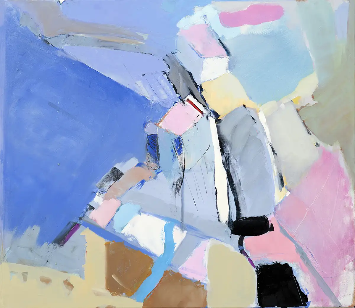 “Sea Town” is an abstract interpretation of a coastal enclave, harmoniously blending architecture with the natural palette of the sea and sky. In this painting, shades of blue dominate, reflecting both the vastness of the ocean and the openness of the heavens, while strokes of pink and beige suggest sandy shores and sunlit buildings. The contrast of black and white adds a modern edge to the traditional seascape, giving it a contemporary feel. This canvas, with its calm and gentle hues, balanced by assertive lines and forms, captures the tranquil yet dynamic essence of a town by the sea. It is perfect for an environment where contemplation and repose are desired, such as a bedroom, private study, or a quiet lounge area.
