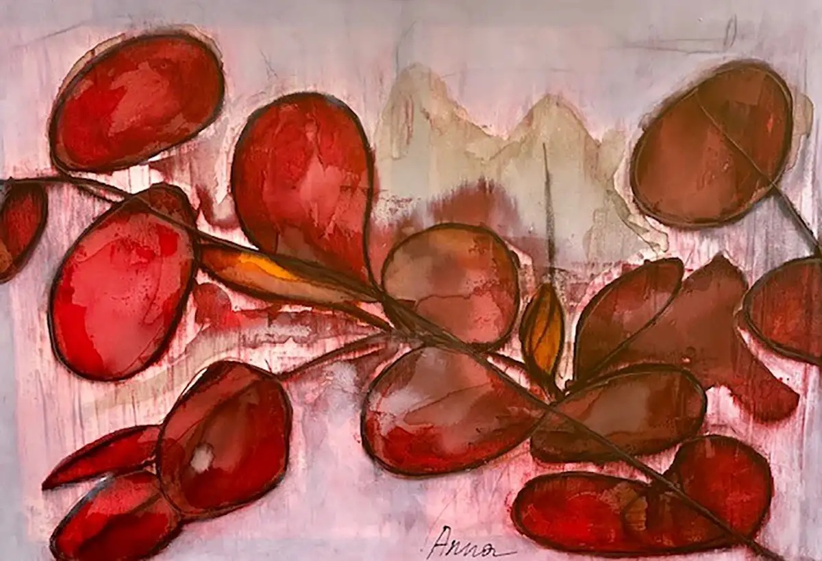"Sensuality" is a striking piece within Anna Ayash's "Nature has given" series, encapsulating the warm, lush energy of nature's offerings. The artwork's vivid reds and browns interplay with delicate shadows and highlights, suggesting the soft, supple texture of leaves and the ripeness of fall fruits. The composition balances between realism and abstraction, inviting viewers to explore the sensual curves and organic shapes that echo nature's own artistry. This painting would be well-suited to an intimate space like a bedroom or a private study, where its rich color scheme and evocative forms can be appreciated for their inherent beauty and the tranquil mood they inspire. Additionally, its dimensions make it ideal for creating a focal point in a cozy living area or a warm welcoming entrance hall.