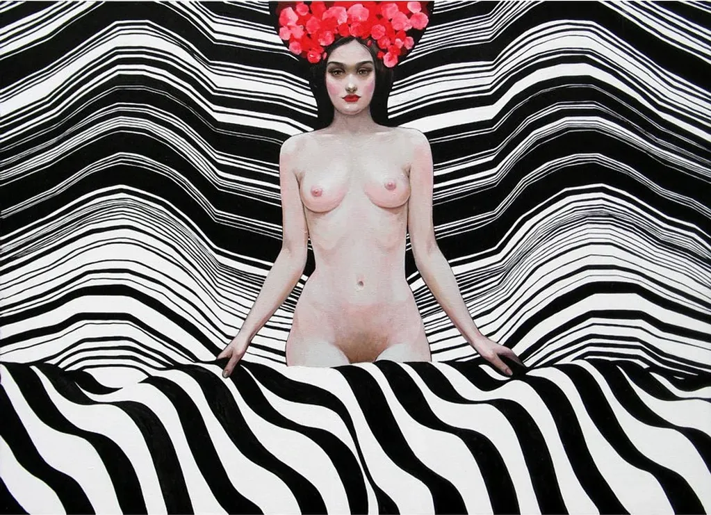 A nude woman, poised in striking confidence, emerges from a hypnotic sea of black-and-white undulating patterns. Her intense gaze and poised posture command attention, while the bold floral crown of vibrant red and pink adds a stark contrast to the monochrome waves around her. The juxtaposition between rigid symmetry and organic softness creates an evocative interplay of illusion and emotion.