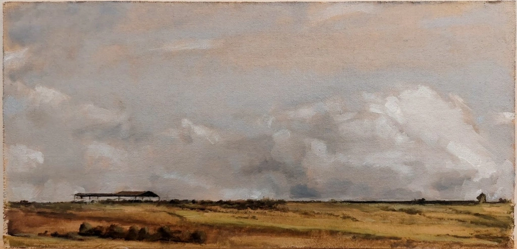 Shed, a stunning oil painting by Israeli artist Assaf Rodriguez captures the understated beauty of a rural scene with remarkable detail. Measuring approximately 25 cm x 51 cm, this wide-format composition features a solitary shed resting on an open plain, under a vast sky painted in muted earth tones and soft grays. Rodriguez’s realist approach emphasizes the gentle interplay of light and shadow, creating a serene and contemplative atmosphere.
