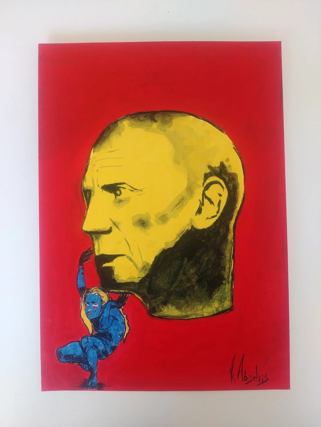 The piece features a monumental yellow head—reminiscent of Pablo Picasso—hovering weightlessly, while a deep blue Sisyphus-like figure appears to bear its weight. Set against a striking red background, this composition evokes themes of artistic burden, influence, and resilience.