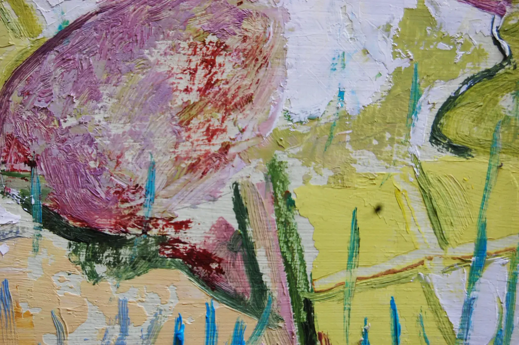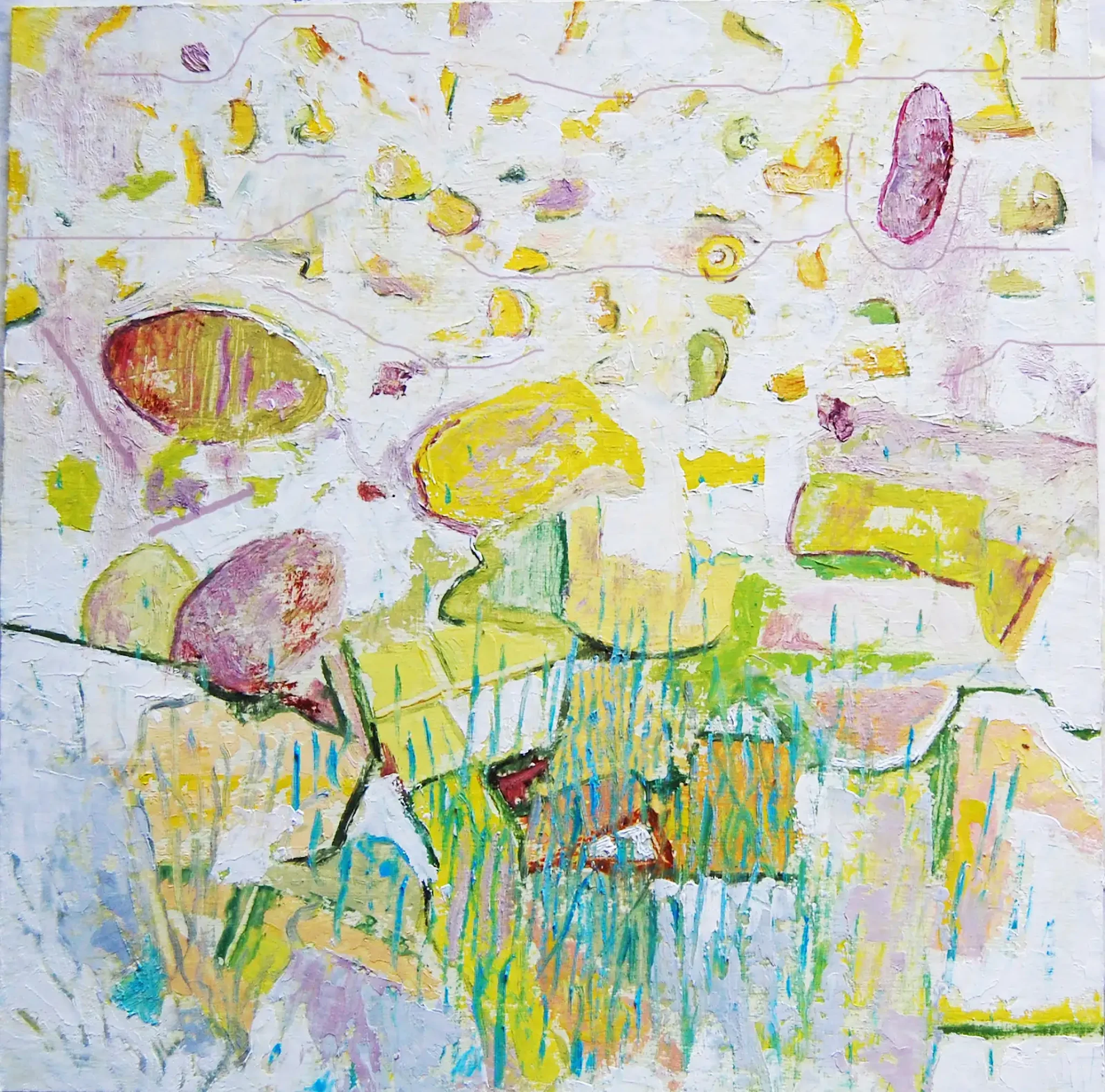 Drawing from his surroundings in the small town of Petrés, Valencia, Cal captures the fleeting beauty of nature in an abstract form. The composition’s layers of soft yellows, greens, and pinks create a harmonious interplay of light and shadow, inviting viewers into a peaceful and reflective space. The delicate textures and broken colors enhance the sense of depth and movement, showcasing Cal’s mastery in layering techniques.