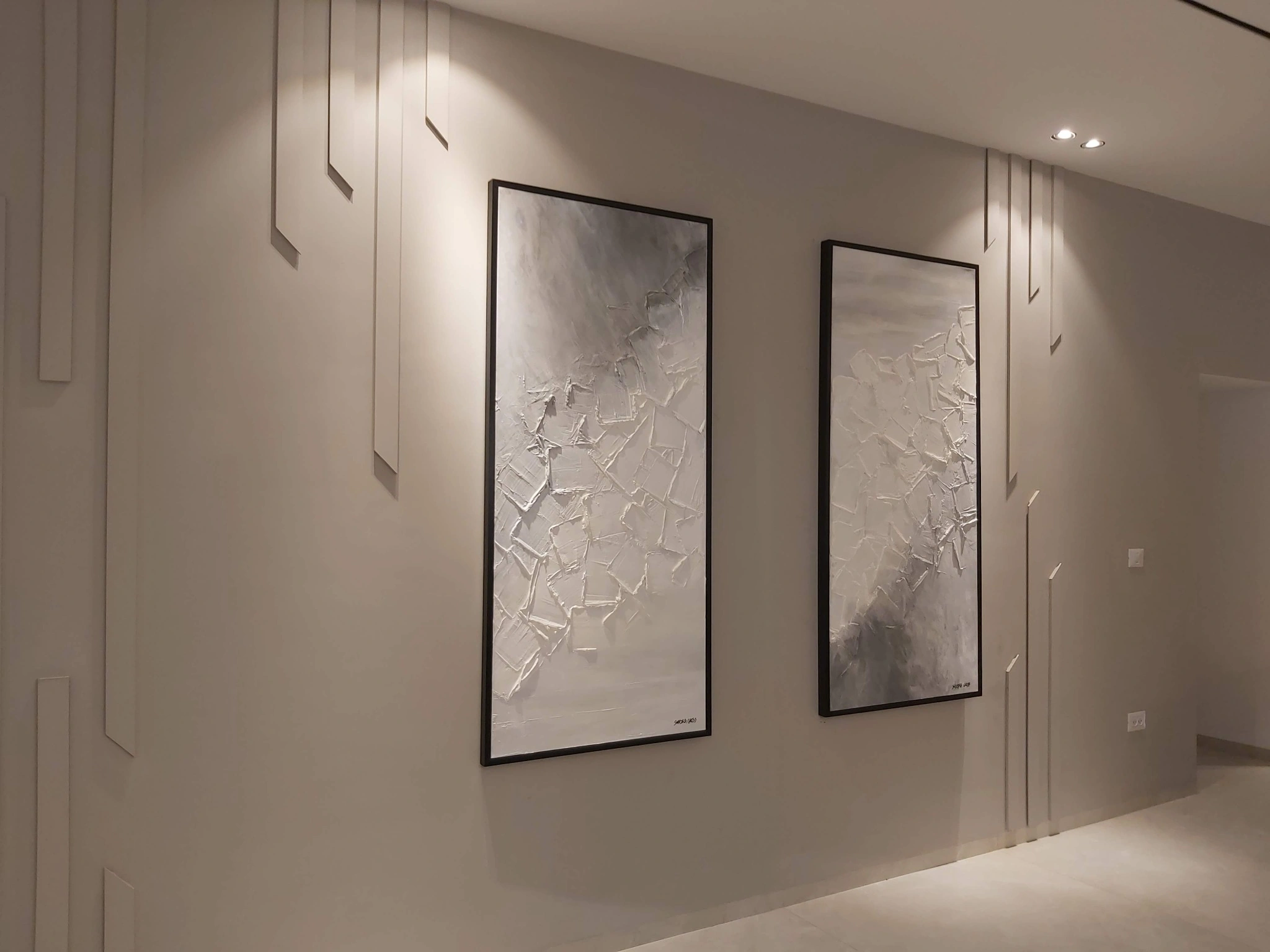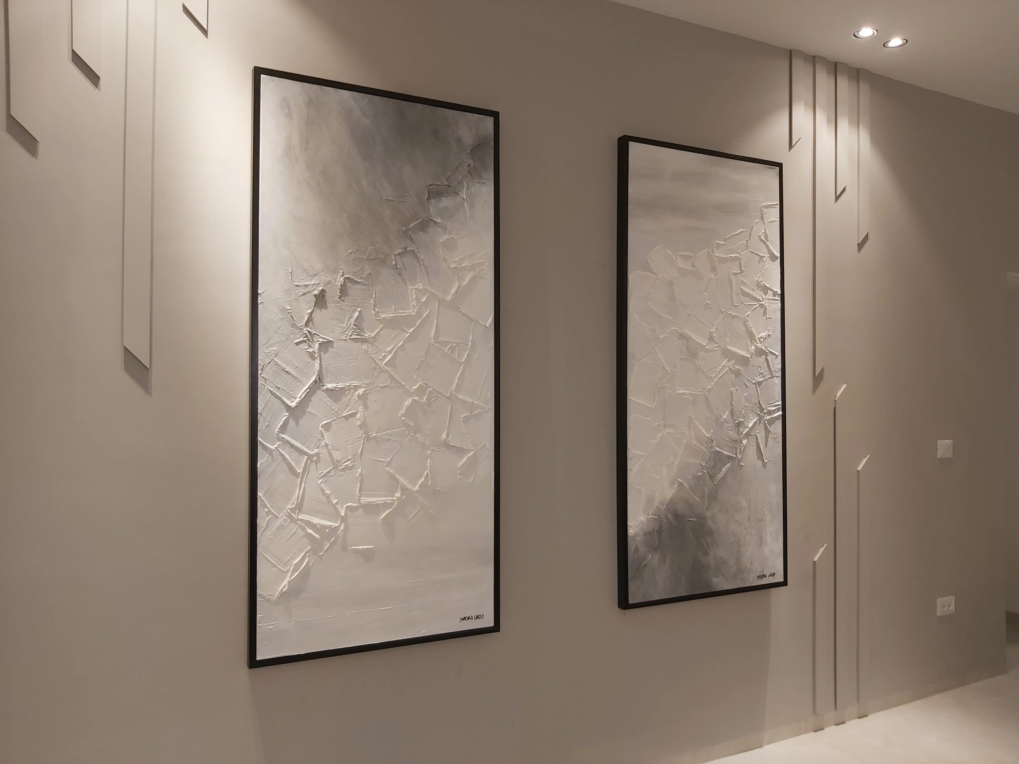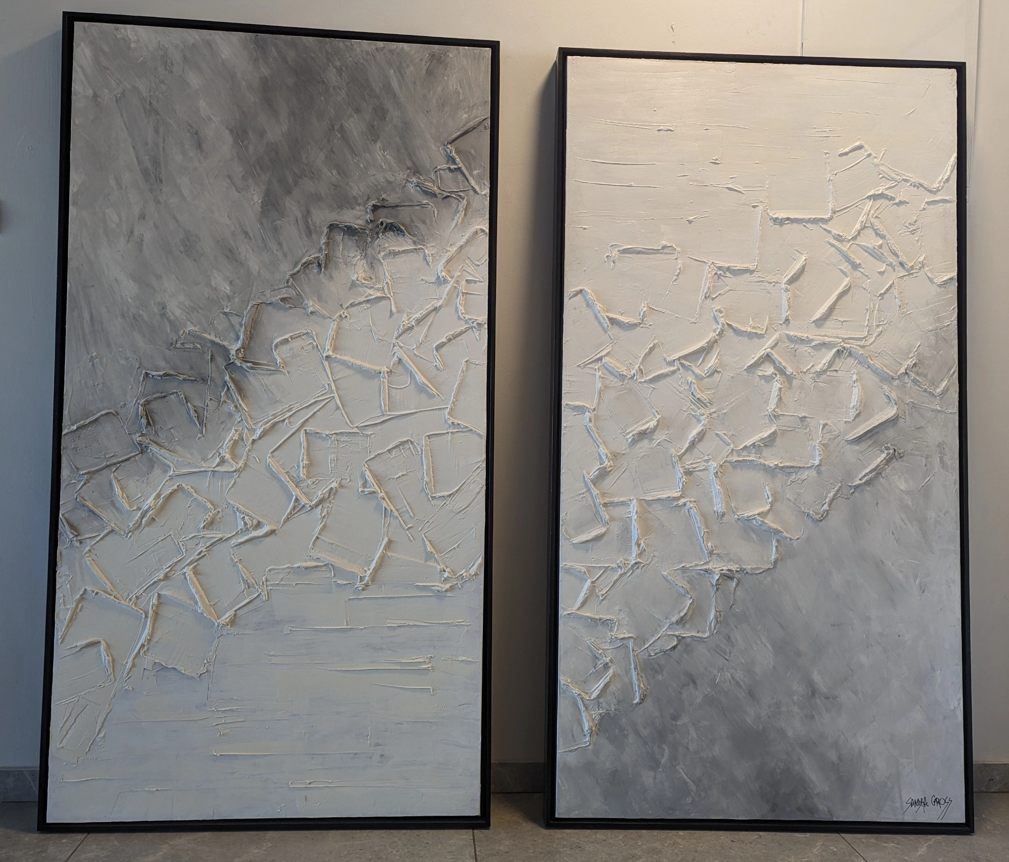 This set of two paintings each 160 x 90 cm is rendered in a monochromatic palette of whites and grays with layered textures that evoke the serenity of a winter’s night.