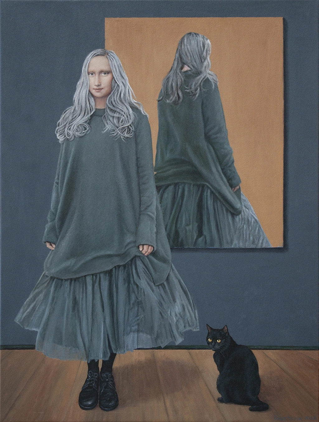 The artwork features a serene figure dressed in soft, oversized garments, standing before a mirror that captures their back view. The muted palette of greys and blues, paired with warm beige and subtle black accents, exudes a tranquil and minimalist aesthetic. The presence of a black cat adds a touch of quiet mystery and depth, enhancing the overall composition.