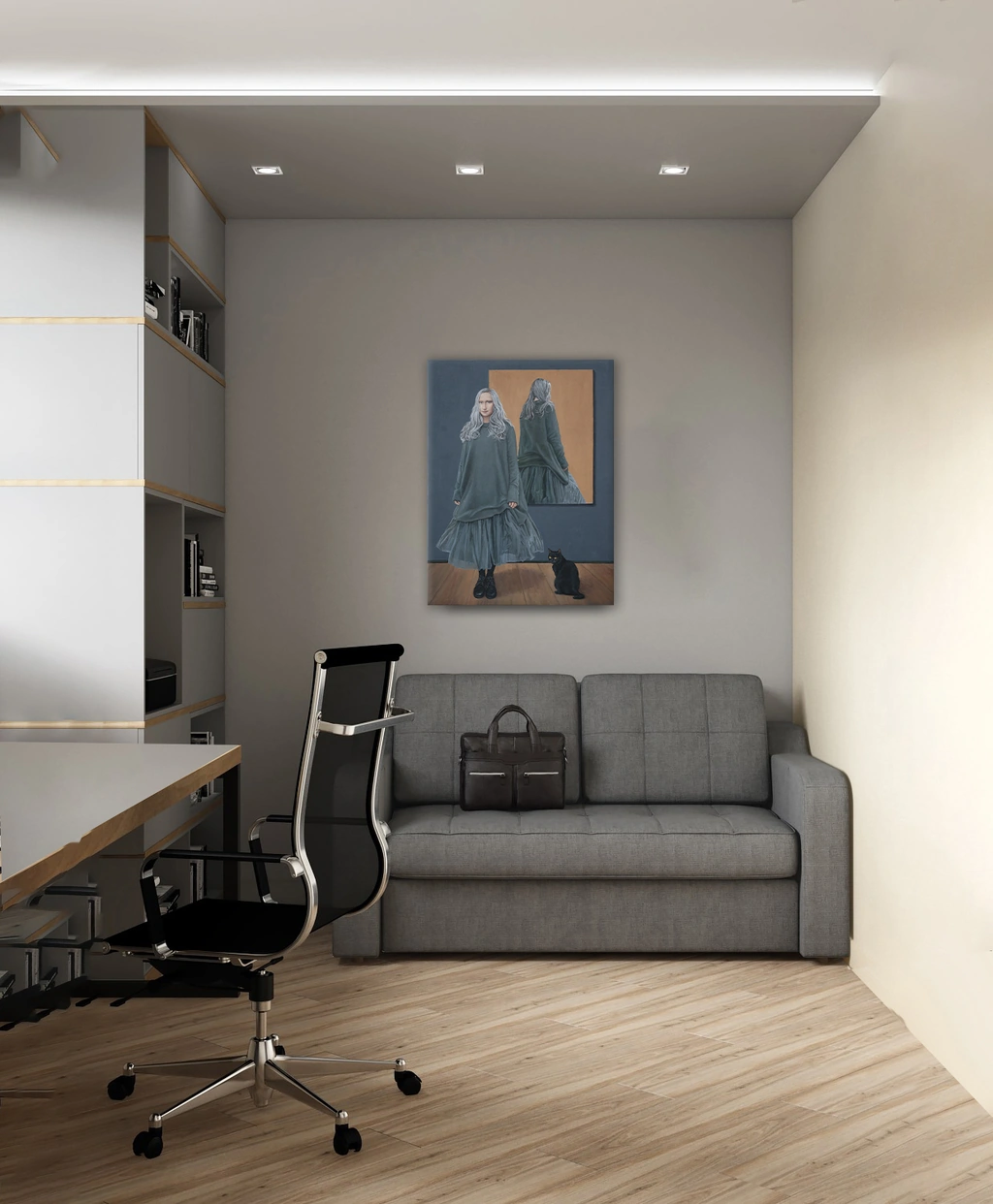 This painting is ideal for living rooms, bedrooms, or art galleries, where it can create a calming and elegant ambiance. Its thoughtfulness and simplicity make it a timeless piece that resonates with contemporary and classical sensibilities alike.