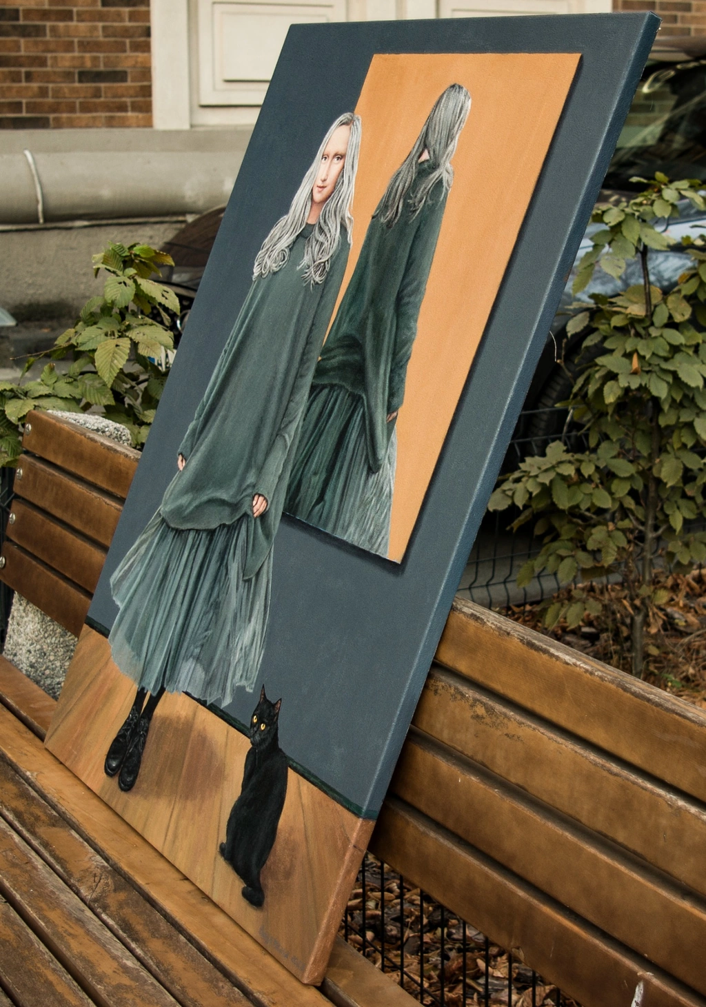 Measuring 100 x 75 cm, this painting combines Amsterdam™ acrylic paints with meticulous brushwork on Unico™ cotton canvas to create a stunning interplay of realism and symbolic reflection.