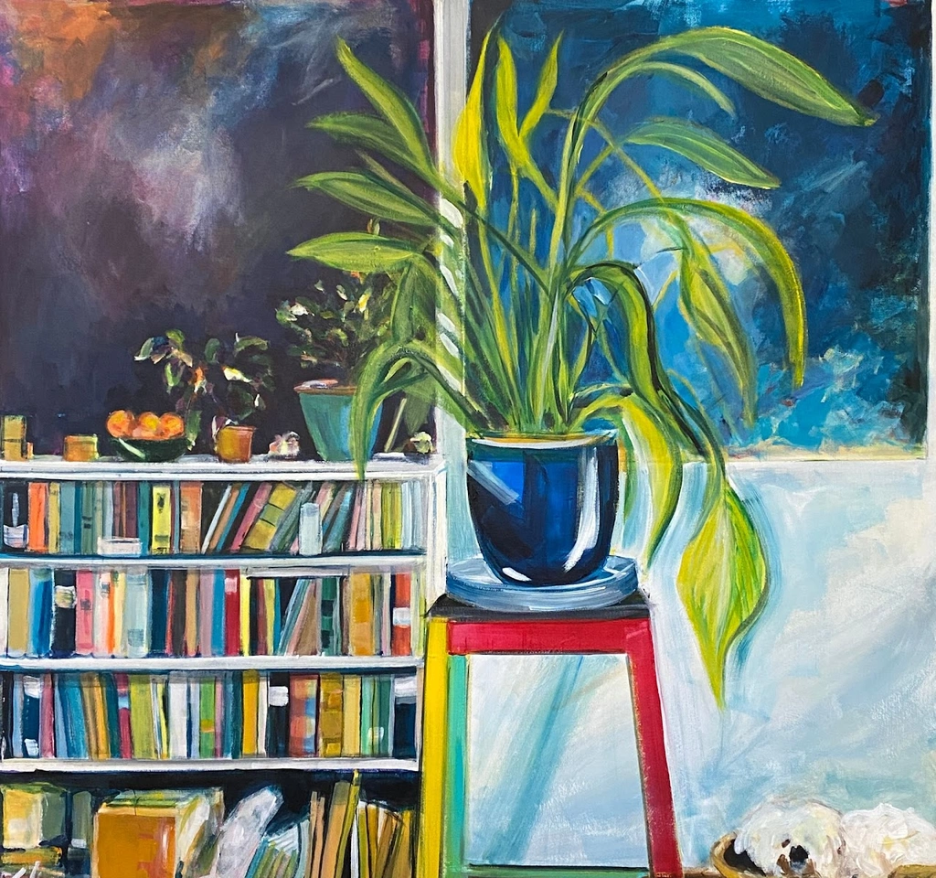 Measuring 100 cm x 100 cm, this contemporary artwork features a vibrant composition of a bookshelf and lush greenery, brought to life with a palette of blues, greens, and yellows, complemented by accents of red and earthy tones.