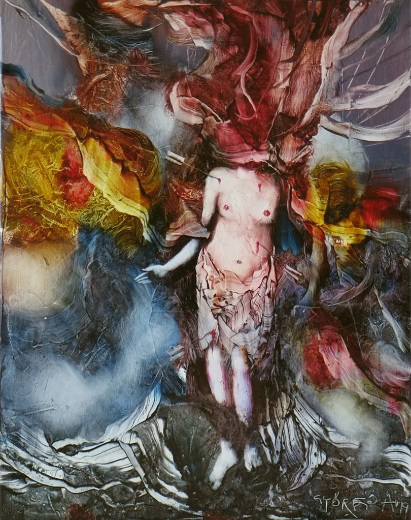 Gyorfi masterfully blends expressionist strokes with surrealist distortion, making the saint’s body appear both human and otherworldly. His ethereal form, stripped yet resilient, embodies suffering, endurance, and a divine metamorphosis. The color palette evokes passion, agony, and enlightenment, drawing the viewer into a deep contemplation of faith and resilience.