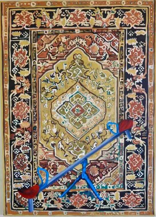 Measuring 140 cm x 100 cm, this intricate artwork features a richly decorated traditional carpet, interwoven with playful elements reminiscent of childhood. The warm earthy tones and vibrant accents evoke nostalgia, while the composition’s cultural essence reflects Agbaria’s dedication to exploring Palestinian traditions and his own life experiences. Perfect for a living room, gallery, or cultural center, “Staged Childhood” is both a celebration of heritage and a window into the artist’s introspective journey. This evocative piece invites viewers to reflect on their own pasts, finding universal meaning within its beauty.