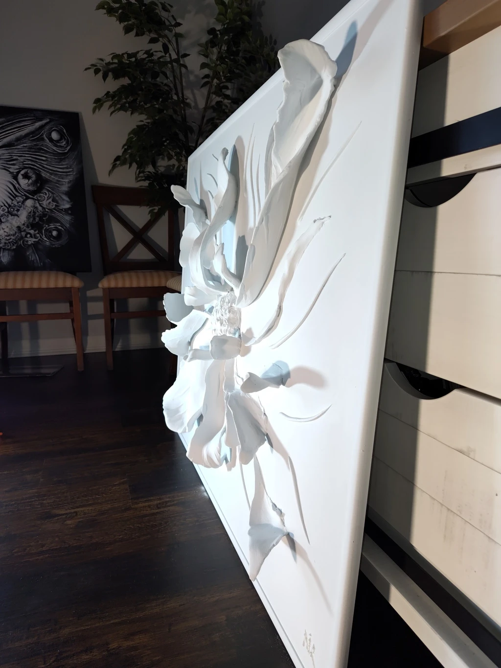 Inspired by the artist’s deep connection to nature and his journey across different cultures, this piece carries a profound sense of movement and transformation. The bas-relief technique adds a tactile dimension, making the viewer experience the artwork not only visually but also through its textured surface. The abstract nature of the piece invites interpretation—some may see a blazing star, others an ethereal cosmic event.