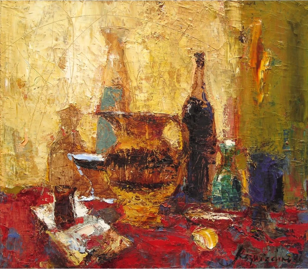 A captivating blend of still life and impressionism, Still Life with a Yellow Jug by Serhiy Reznichenko brings warmth and vibrancy to the canvas.