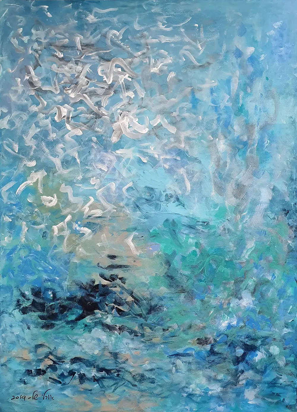 In the 50 cm by 70 cm canvas of "Storm in the Blue," Orly Shalem invites viewers into the midst of a maritime squall. The artwork is a visual symphony of chaos and harmony, where the tempestuous motion of the sea and sky is depicted through dynamic strokes of white on a background of varied blues. This contrast creates a sense of depth and intensity, embodying the unpredictable nature of a storm. The painting is ideal for stimulating environments that embrace nature's raw power, such as a modern living space, an office, or a public area that seeks to captivate and energize its audience.