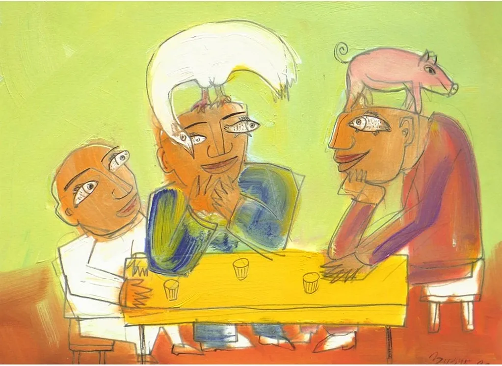 The painting features a group of expressive, surreal figures deeply engaged in storytelling, their exaggerated gestures and whimsical expressions pulling the viewer into their world. Using Naïve Art, Surrealism, and Expressionism, Zuzuk creates an atmosphere that is both playful and deeply thoughtful.