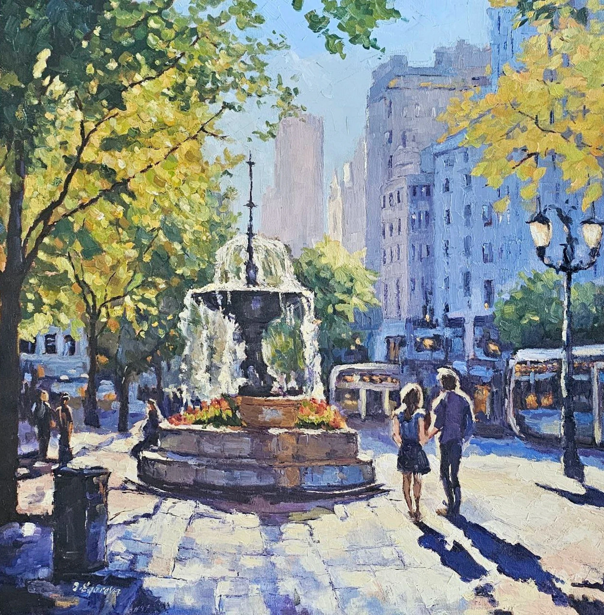 “Summer Inspiration” by Olga Egorov radiates warmth, connection, and light. This 60x60 cm oil painting captures a golden summer afternoon in the city, where a central fountain bursts with light and movement, framed by the dappled shade of leafy trees. A couple strolls hand-in-hand into the glowing distance, creating a focal point of romantic tranquility. Egorov’s impressionistic technique, filled with rich texture and expressive strokes, brings the energy of a living city to canvas while preserving a dreamlike serenity. This artwork invites viewers to immerse themselves in a poetic moment of harmony, where love, sunlight, and the rhythms of city life dance together effortlessly.