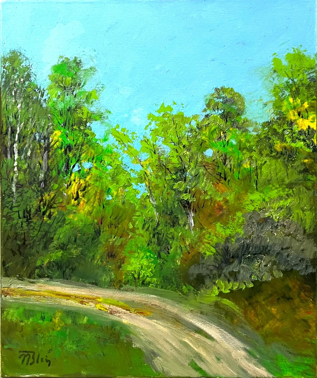 Blei’s expressive brushwork brings movement and depth to the scene, making the trees appear to sway gently in the summer breeze. The interplay of light and shadow creates a mesmerizing sense of dimension, inviting the viewer to immerse themselves in the peaceful yet vibrant atmosphere. The path, curving naturally through the composition, adds a sense of exploration and tranquility, making this piece both invigorating and soothing.
