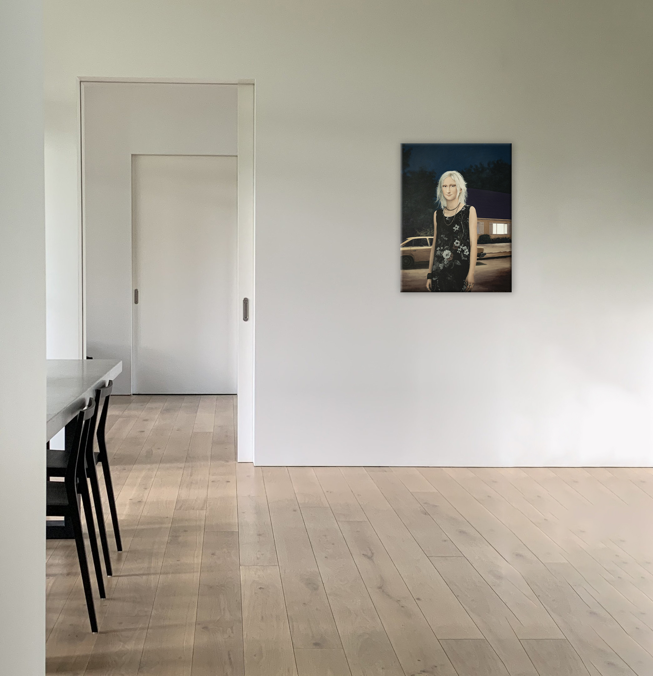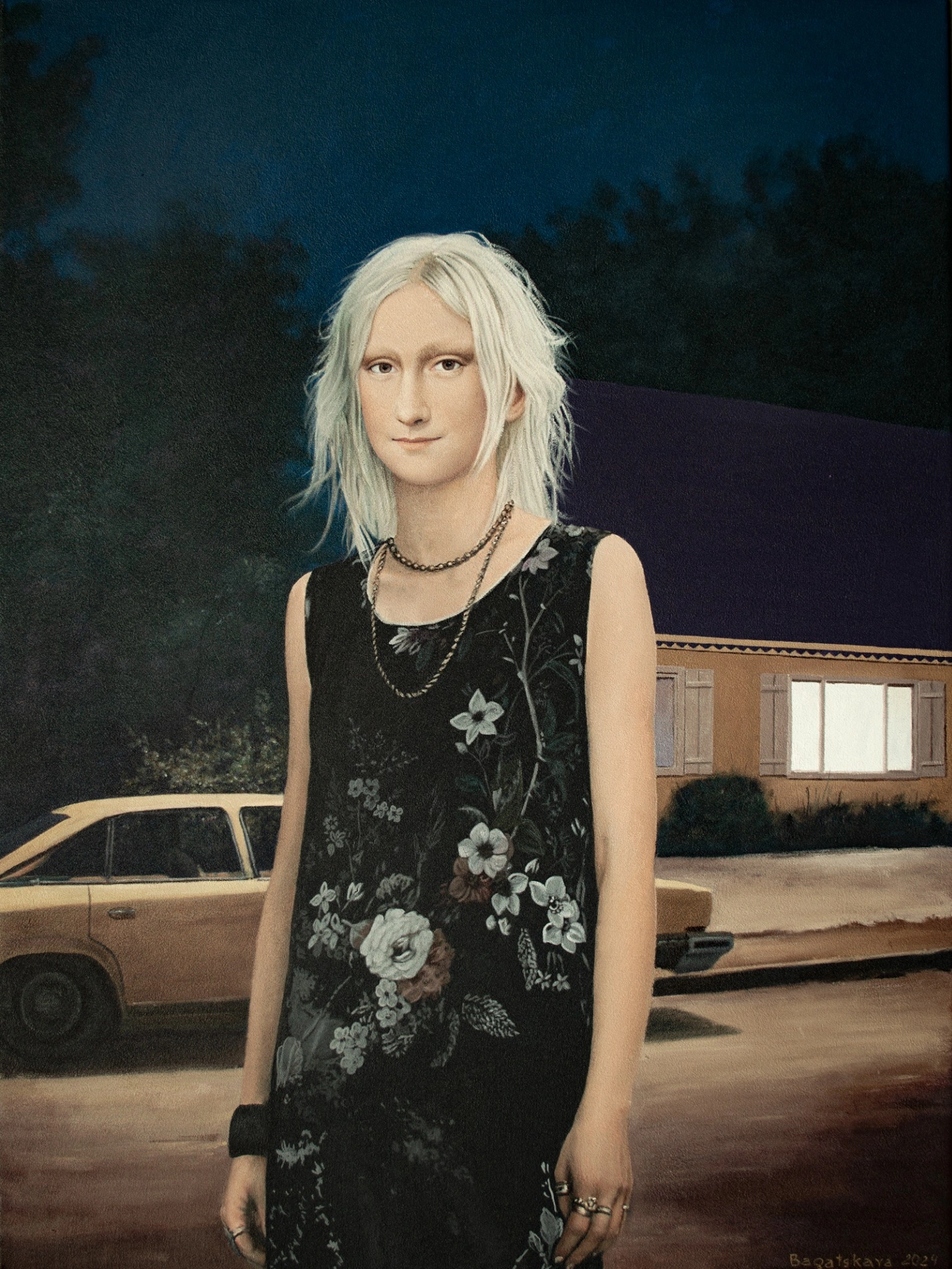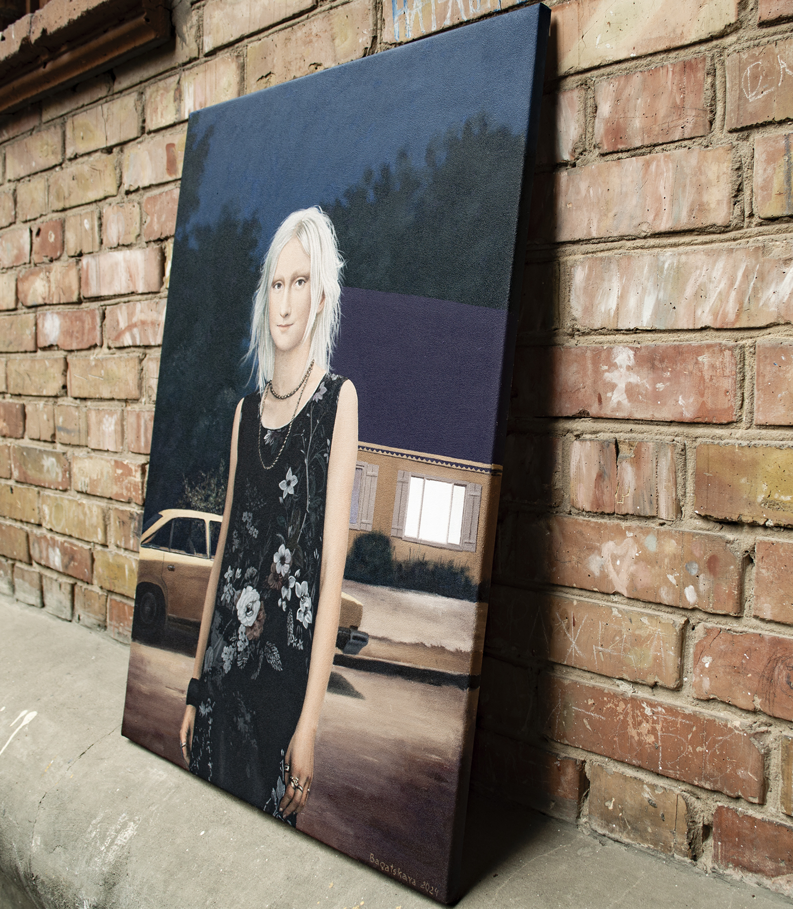 “Summer Night” by Nataliya Bagatskaya is a portrait of quiet strength, resilience, and stillness under a darkened sky. Rendered in fine acrylic realism, a serene figure stands before a dimly lit home and vintage car, her floral dress glowing softly against the mystery of the night. This work captures the haunting calm of post-curfew silence and personal reflection. Part of the “Life in Avatar” series, it invites deep thought and brings poetic tranquility to any space.