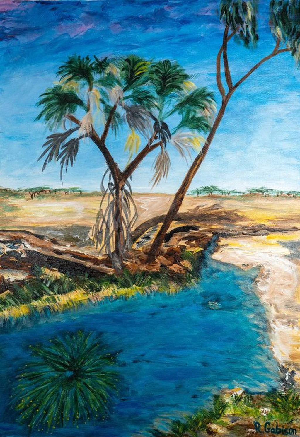 Measuring 50 cm x 35 cm, the artwork transports viewers to a serene landscape featuring lush palm trees swaying beside a sparkling blue stream. Gabison’s masterful use of impressionistic brushstrokes and earthy tones brings the scene to life, while the bright blues of the water evoke a refreshing sense of escape. This tranquil depiction of nature invites viewers to pause and immerse themselves in the beauty of the outdoors. Perfect for a living room, vacation home, or gallery space, “Summer Vacation” is an ideal addition for anyone seeking to bring a touch of tropical serenity into their surroundings.