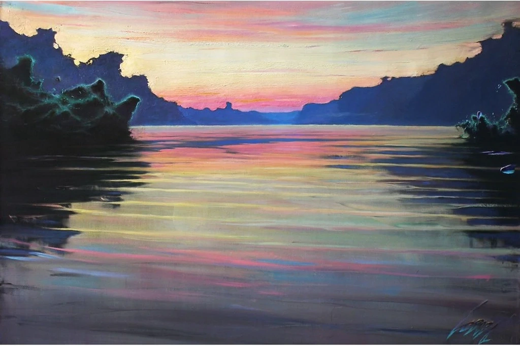 The artist masterfully blends soft pinks, golden yellows, and deep blues, creating a sky that reflects onto the calm, rippling surface below. Silhouetted hills and darkened foliage frame the composition, enhancing the depth and tranquility of the scene. The interplay of light and shadow evokes a sense of nostalgia and peace, making the viewer feel as if they are standing at the water’s edge, witnessing the day’s final embrace. Loboda’s skillful fusion of realism and impressionism allows the colors to melt seamlessly, creating an almost dreamlike effect. Whether displayed in a luxurious living room, spa, or hotel suite, "Sunset" transforms spaces into havens of relaxation and contemplation. A must-have for collectors seeking a masterpiece that radiates serenity and timeless beauty.