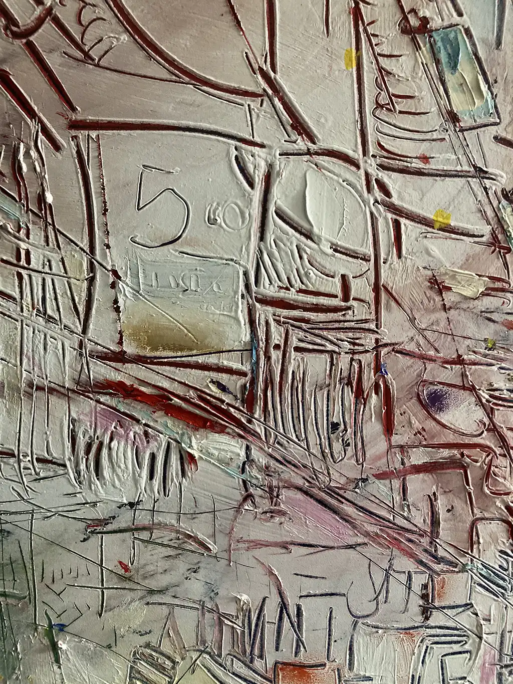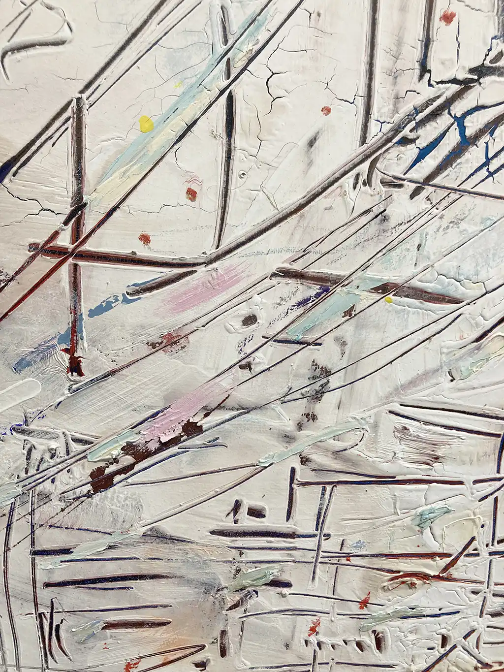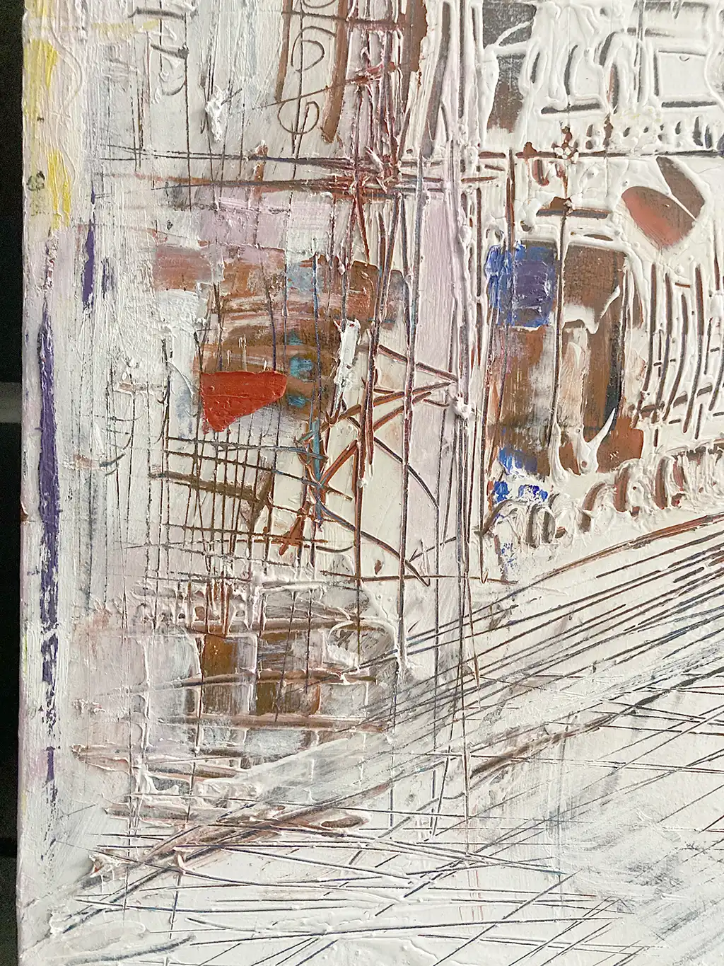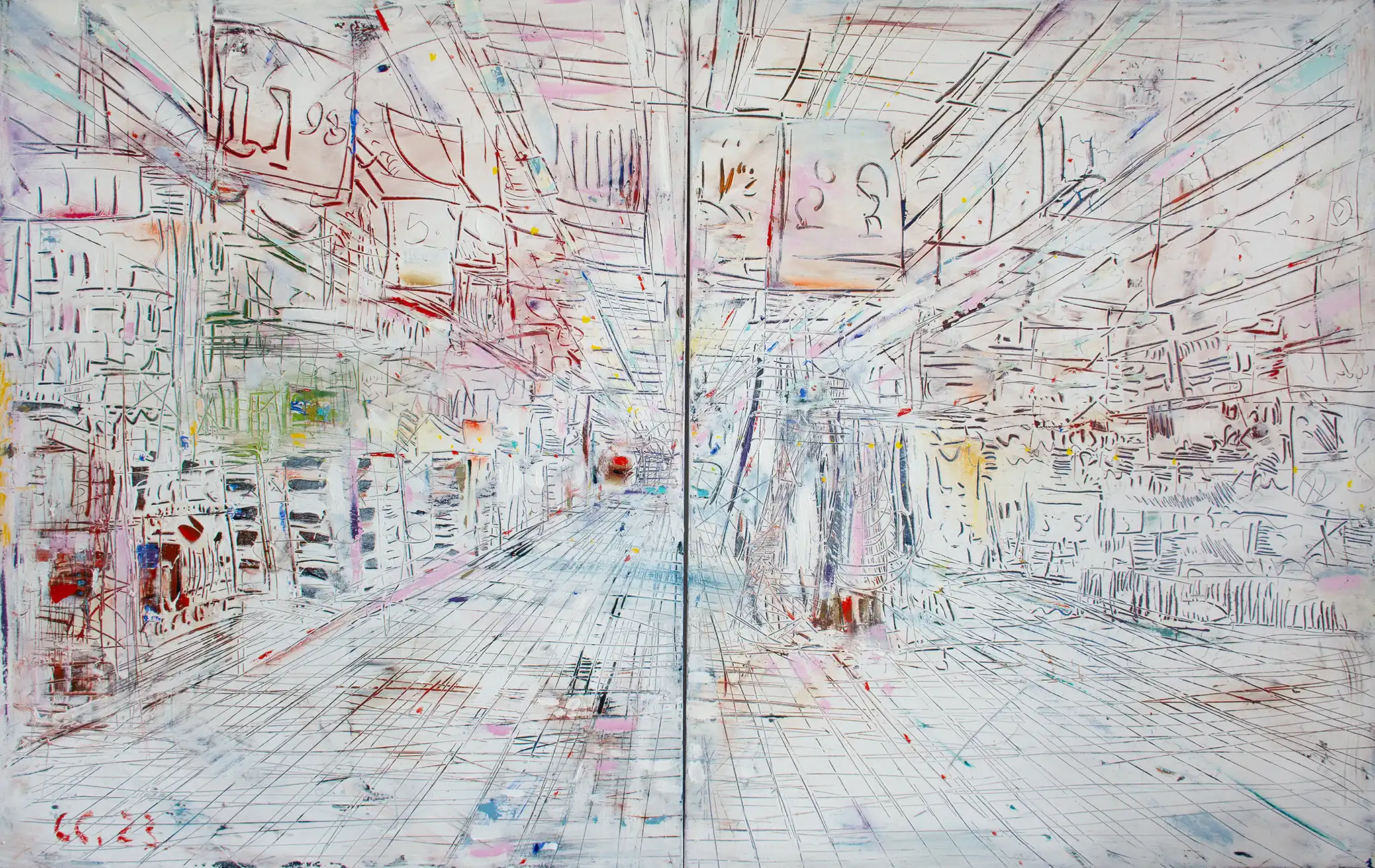 Created in 2023, this 180 x 240 cm piece, rendered in oil and acrylic, captures the essence of a commercial space with lines and structures that recede into the background, creating a feeling of depth and vastness. The artwork’s soft, muted tones—light washes of white, grey, pink, and occasional color splashes—suggest a dreamlike atmosphere, as if the viewer is gazing upon a memory or a fleeting impression. Savchenko's minimalist approach, with delicate line work and sparse use of color, emphasizes the emptiness and quietude of the space, inviting viewers to reflect on the nature of urban life and modern consumerism. Perfect for contemporary galleries, corporate spaces, or modern living areas, "SUPERMARKET" brings a unique blend of modernity and nostalgia, capturing the poetic stillness of everyday life.