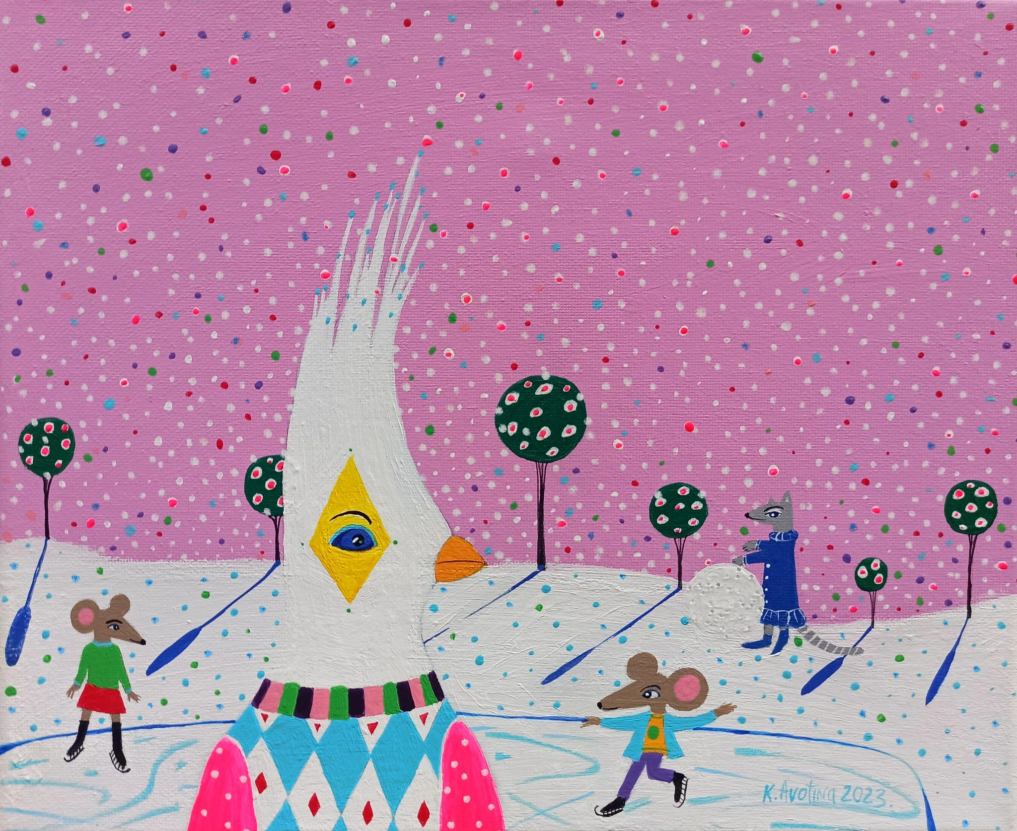 “Supervisor” by Katrina Avotina is a joyful winter scene where a giant bird quietly watches over a group of whimsical animals at play. Mice skate, a raccoon builds a snowball, and color-dotted trees pop against a pink snowy sky. Painted in bright acrylics on a 30×25 cm canvas, this naïve-style piece blends humor and fantasy. Perfect for children’s rooms, hallways, or any space craving imagination and joy.