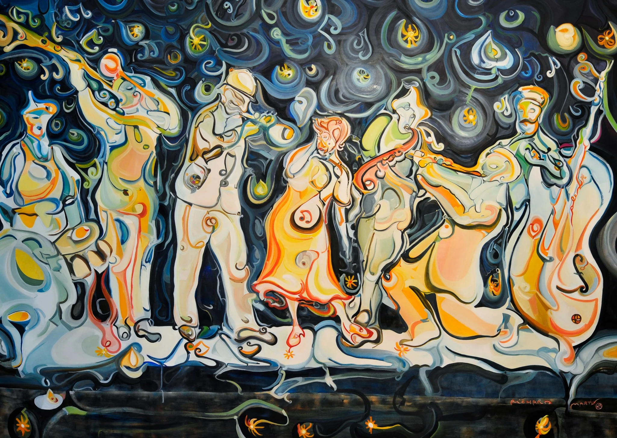 The piece uses dynamic curves and vibrant colors to depict abstract musicians in perfect harmony. Rich tones of blue and black set the stage, while glowing accents of yellow, orange, and red bring the scene to life. This artwork celebrates the joy of music and movement, making it ideal for private collections, music-themed spaces, and exhibitions focused on artistic expression and rhythm.