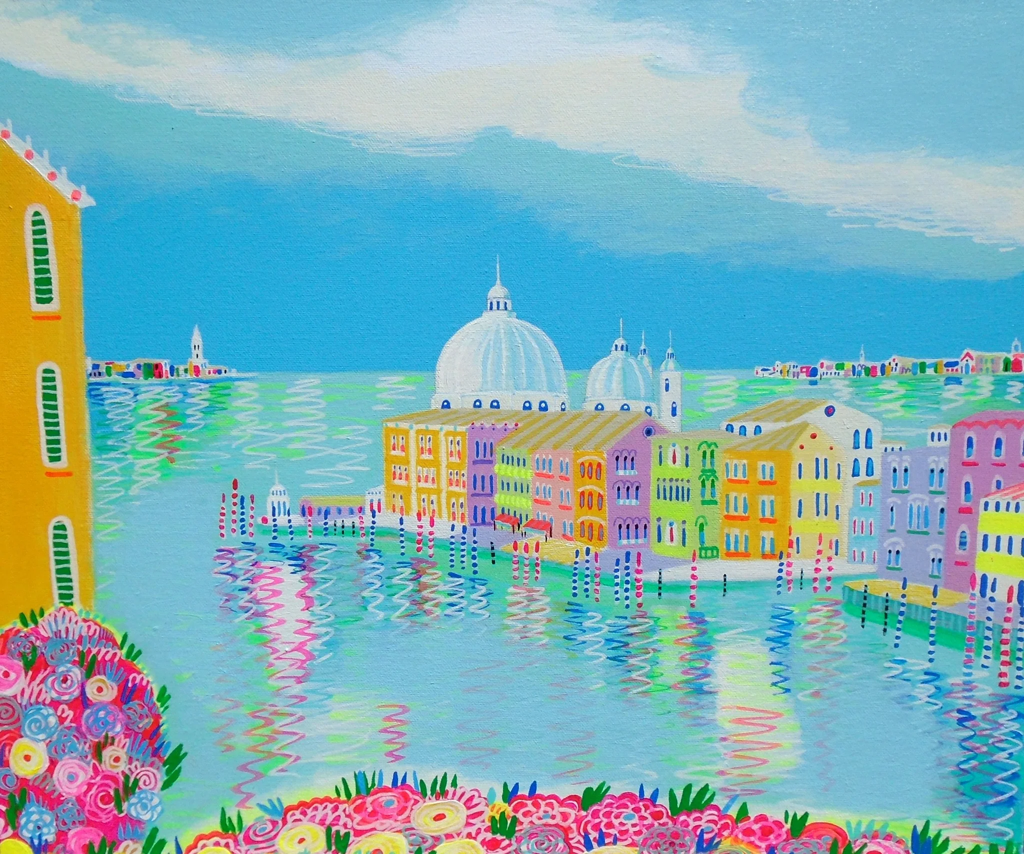 Painted in acrylic on canvas, this stunning composition showcases the city’s colorful facades, historic domes, and shimmering reflections on the tranquil water.