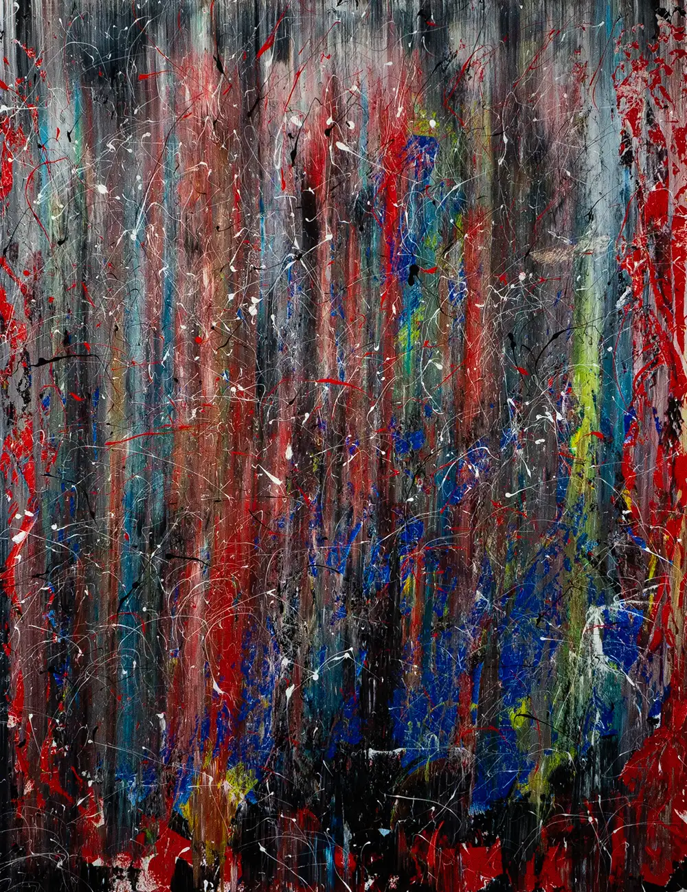 A turbulent fusion of colors, creating a raw, vivid tableau. The dynamic reds, deep blues, and striking splashes embody a spirited expression of freedom and the complexity of the dream.