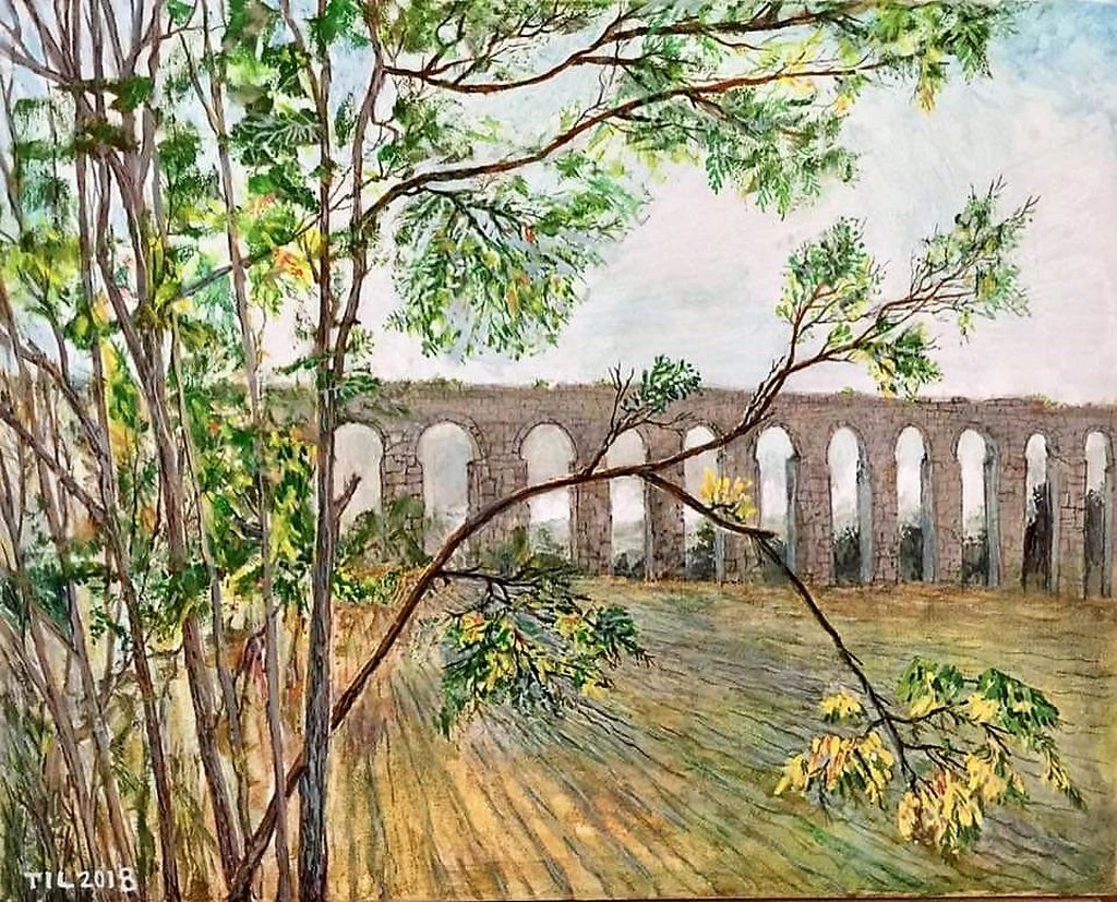 This oil painting captures the timeless beauty of an aqueduct framed by vibrant trees and soft blue skies, creating a harmonious balance between nature and history. Terehovsky’s attention to detail brings the textured stones of the aqueduct and the gentle shadows of the branches to life, evoking a peaceful yet majestic atmosphere.