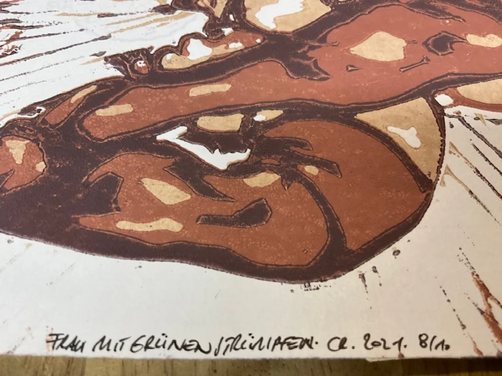 The artwork captures a reclining woman in vivid motion, her form rendered in earthy tones of brown and beige, accented by the contrasting green stockings that give the piece its title. Reimann’s use of reduction printing on Büttenpaper allows for intricate layers of texture and color, creating a sense of depth and vibrancy. The energetic, radiating lines surrounding the figure amplify the dynamism, drawing the viewer’s eye to the interplay of human form and movement.