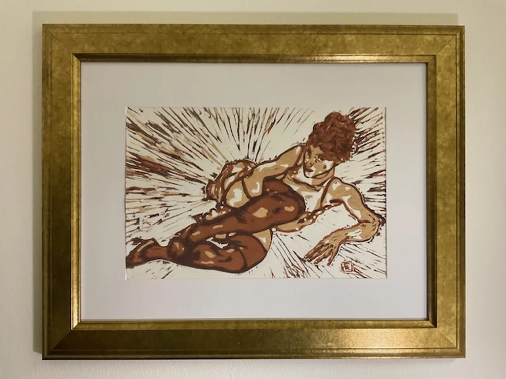 This limited-edition print is part of a series of 10 unique pieces, each handcrafted with water-based colors and pencil detailing. Inspired by Schiele’s iconic explorations of the human figure, Reimann imbues the piece with a contemporary vitality that transcends time, bridging expressionist tradition and modern interpretation.