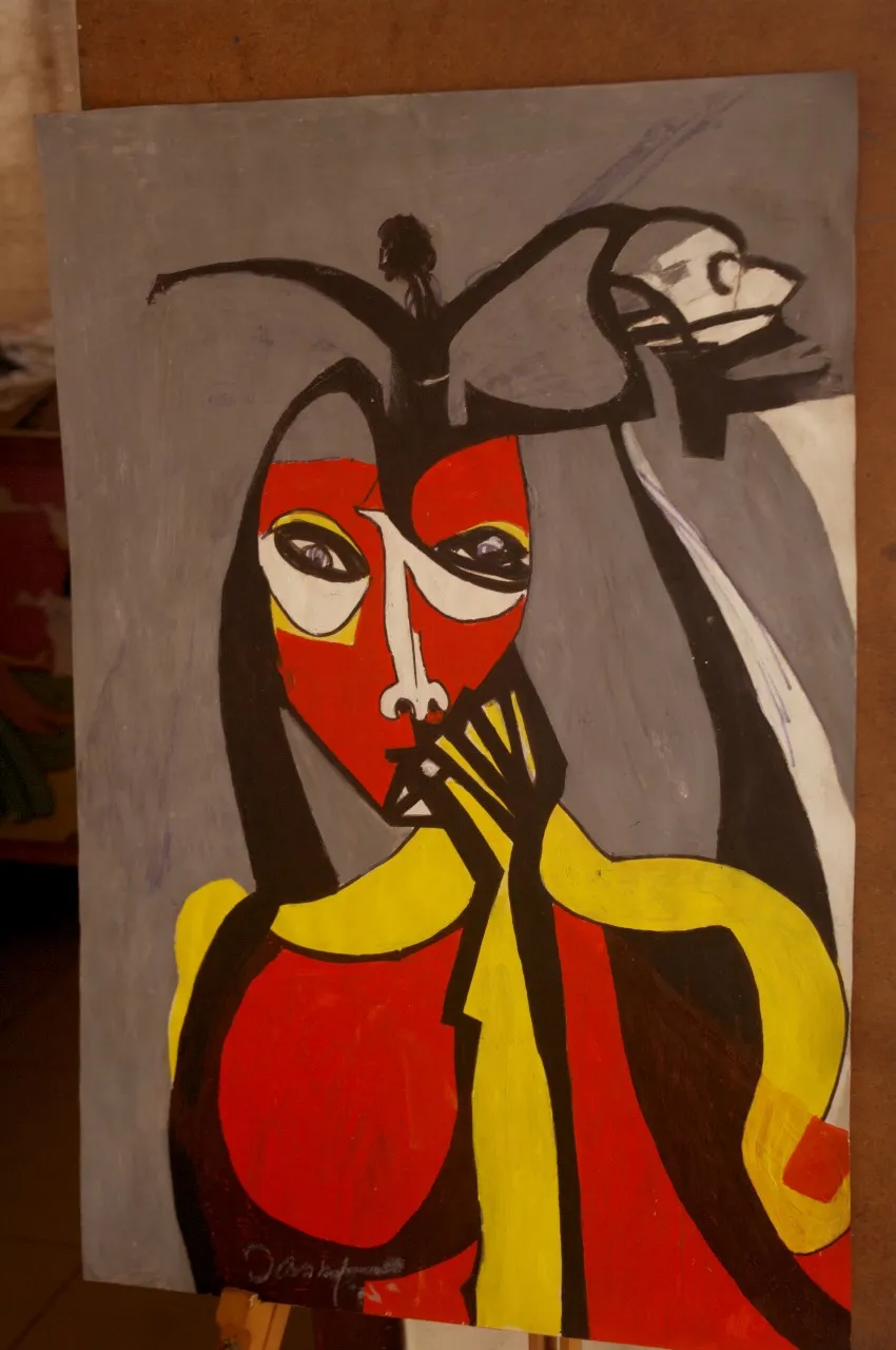 "The Aura" by Tashfeen Rizwan is a powerful Cubist portrait that merges feminine presence with symbolic abstraction. Painted in acrylics on paper, the composition fuses bold contrasting tones of red, yellow, black, and gray to evoke a mystical and emotional energy around the figure. The figure's hidden gesture and intense gaze provoke reflection, mystery, and a quiet strength, while symbolic forms rise like thoughts or spirits from her hair. This captivating, dramatic work is ideal for spaces that value introspection—such as a study, guest room, or library.