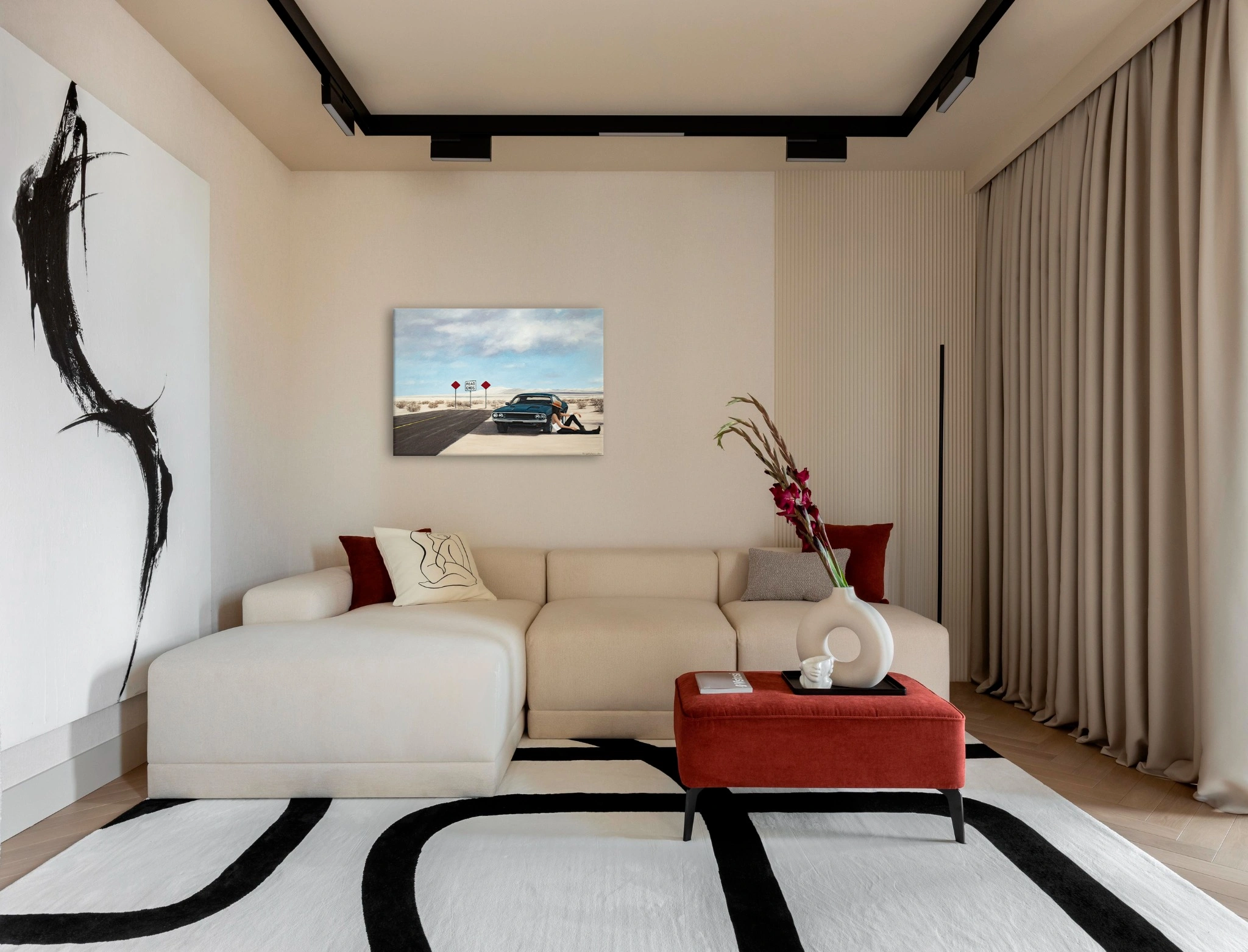 “The Beginning of the Road” by Nataliya Bagatskaya is a realist acrylic painting capturing a symbolic moment of pause. A woman sits beside her vintage car at a "ROAD ENDS" sign, contemplating the still horizon. Through this simple yet profound composition, the artwork reflects turning points, personal decisions, and new perspectives. Rich in metaphor, calm in mood, and precise in execution, this piece from the “Life in Avatar” series brings emotional depth to any thoughtful space.