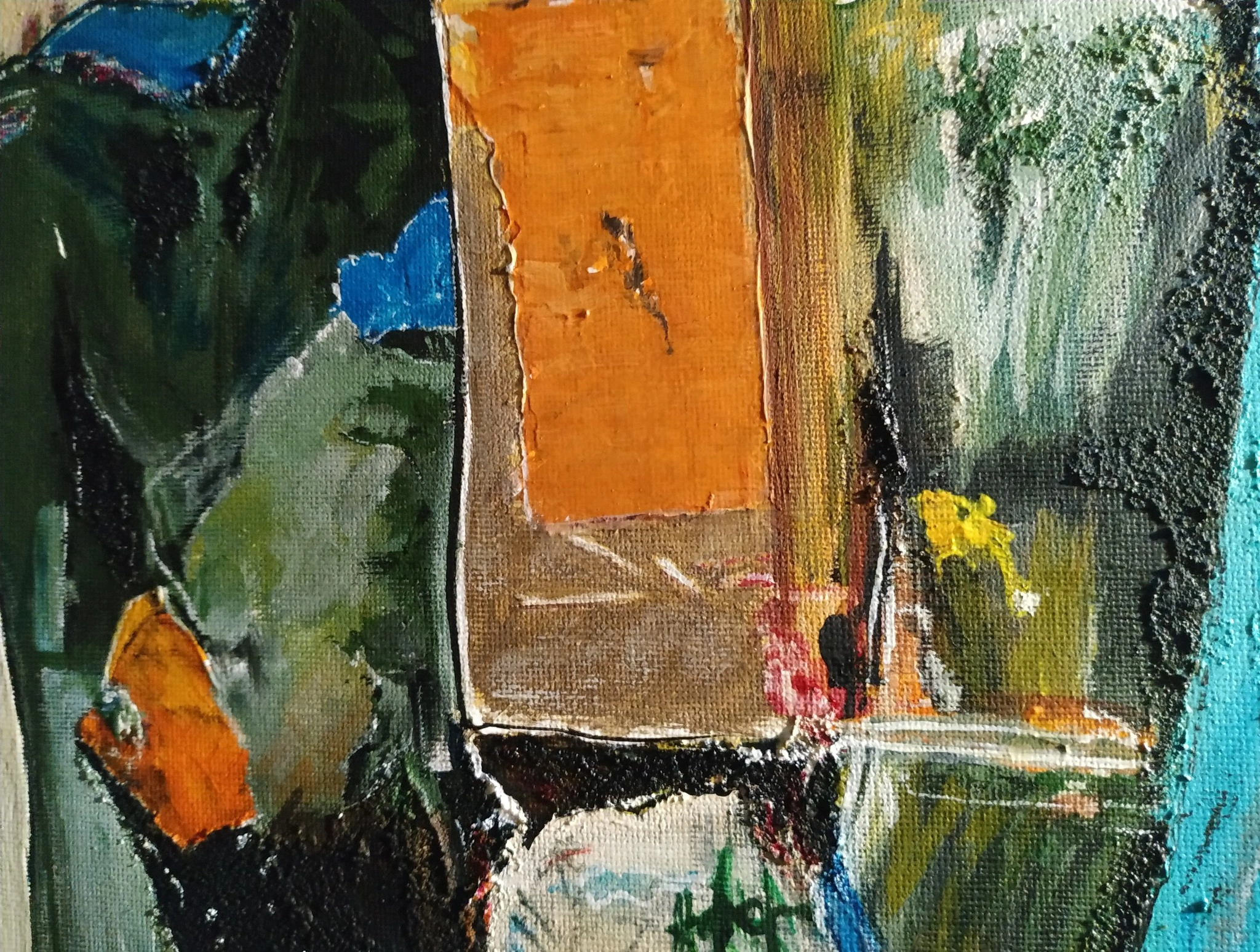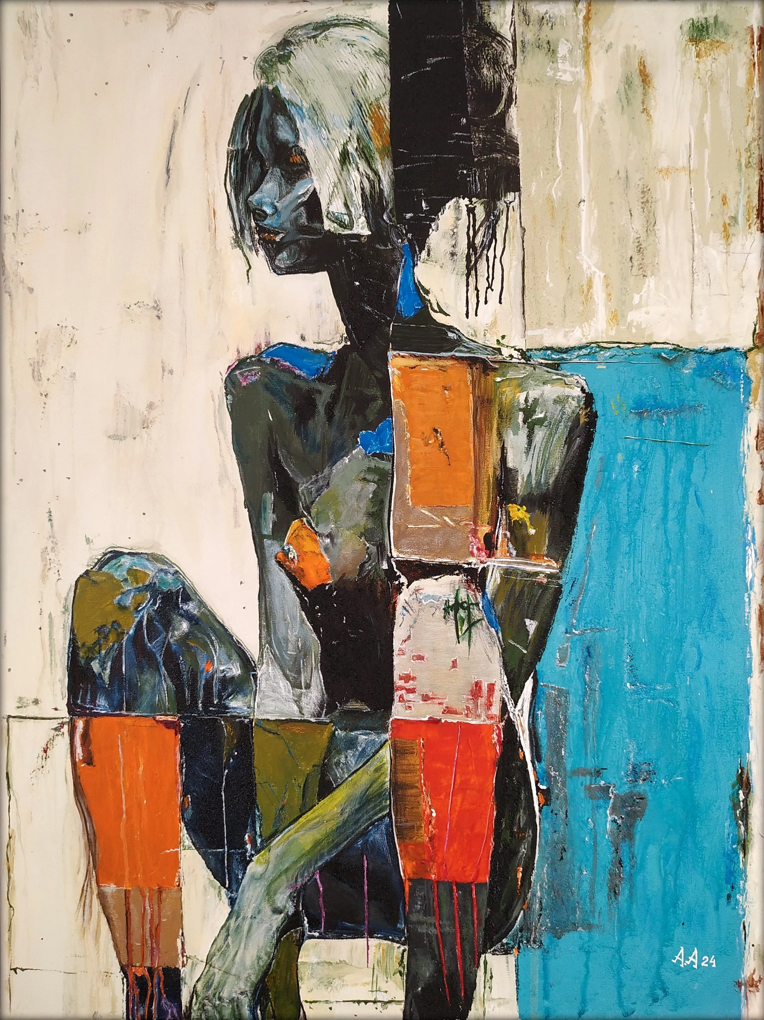 The Colors of February captures a moment of deep solitude and reflection, blending the figurative and abstract in a striking acrylic on canvas composition. A seated female figure emerges through geometric textures, where blocks of muted teal, burnt orange, and olive green convey emotional depth and the chill of February’s quiet pause. The contrasted, earthy palette speaks of memory, presence, and layered emotion. This emotionally rich piece offers a contemplative, serene atmosphere—perfect for interiors like a study, library, or guest room.