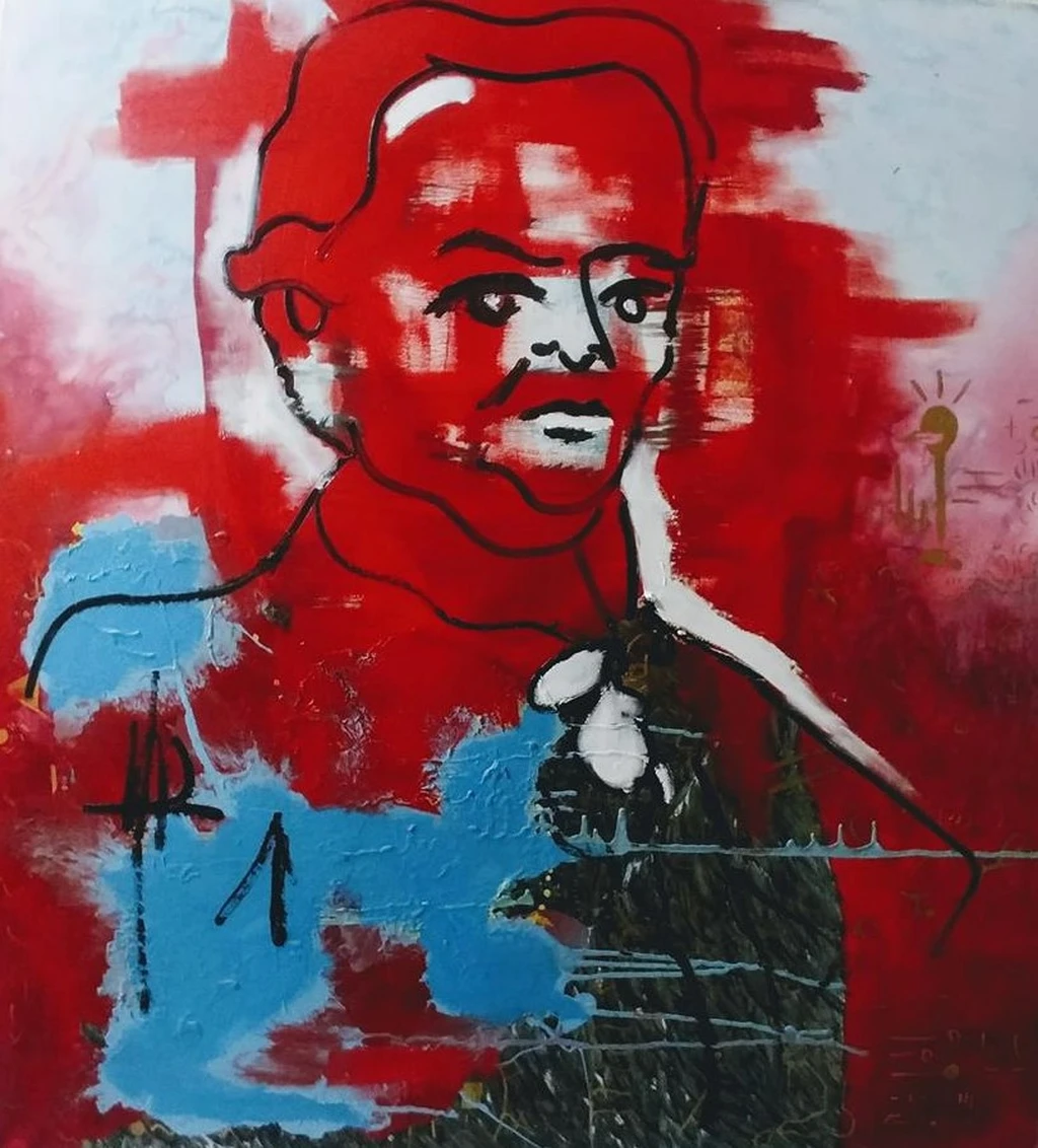 The central figure, painted in deep red tones, is framed by abstract elements that create a dramatic atmosphere. The face, outlined in black, appears both authoritative and enigmatic, evoking themes of power, judgment, and historical significance. Contrasting patches of blue and white add depth, breaking the intensity of the red and inviting contemplation.