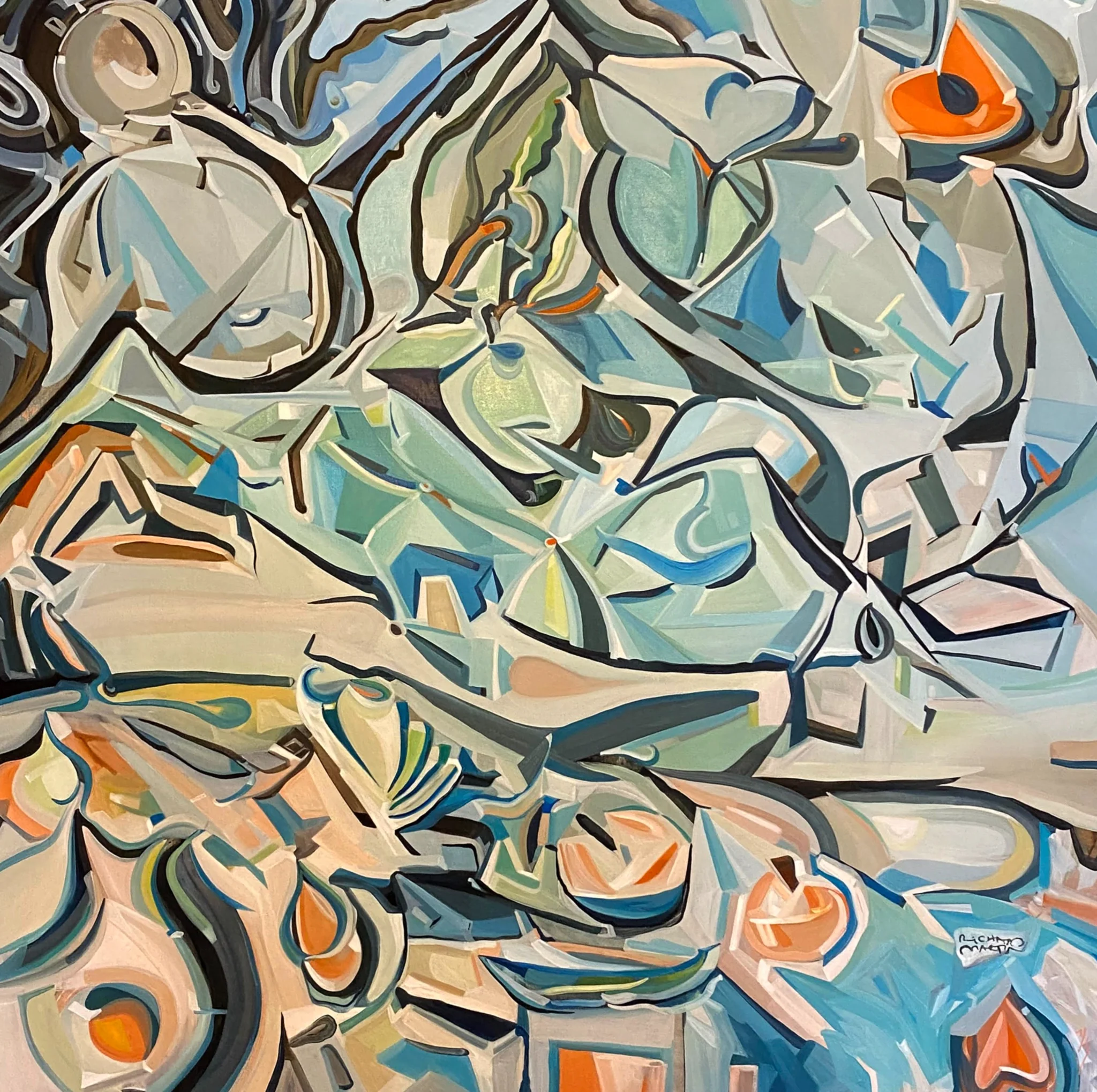 The artwork uses geometric abstraction and flowing curves to convey movement and transformation. Dominated by cool blues and greens, with warm accents, it invites viewers to reflect on their spiritual journey and personal growth. This piece is perfect for private collections, spiritual spaces, and contemporary art exhibitions.